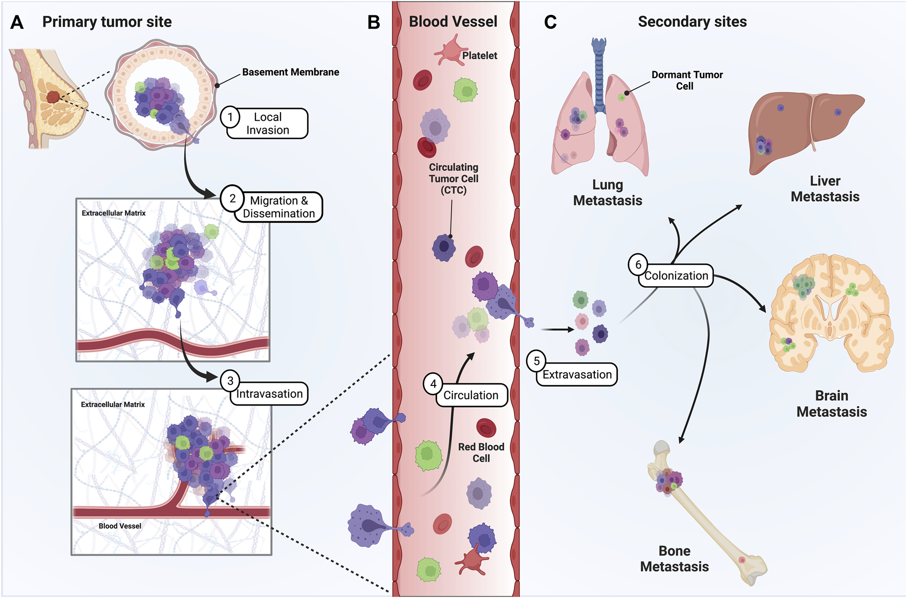 Metastatic progression of breast cancer from the primary tumor site to distant secondary sites is a multistage process. Presented herein is a graphic depicting the steps of breast cancer metastasis. (A) To metastasize, heterogenous tumor cells must leave the primary tumor site, often by invading through the ductal basement membrane, migrating through the ECM, and intravasating into circulation. (B) Once in circulation, single CTCs and/or CTC clusters must survive the shear stress and immune microenvironment of the vasculature until they adhere along the vessel wall at distant sites. (C) Eventually, disseminated tumor cells extravasate, proliferate, and colonize distant sites of the lung, liver, brain, and/or bone. However, some tumor cells can remain dormant at these secondary sites, representing a significant risk and clinical challenge for breast cancer patients.