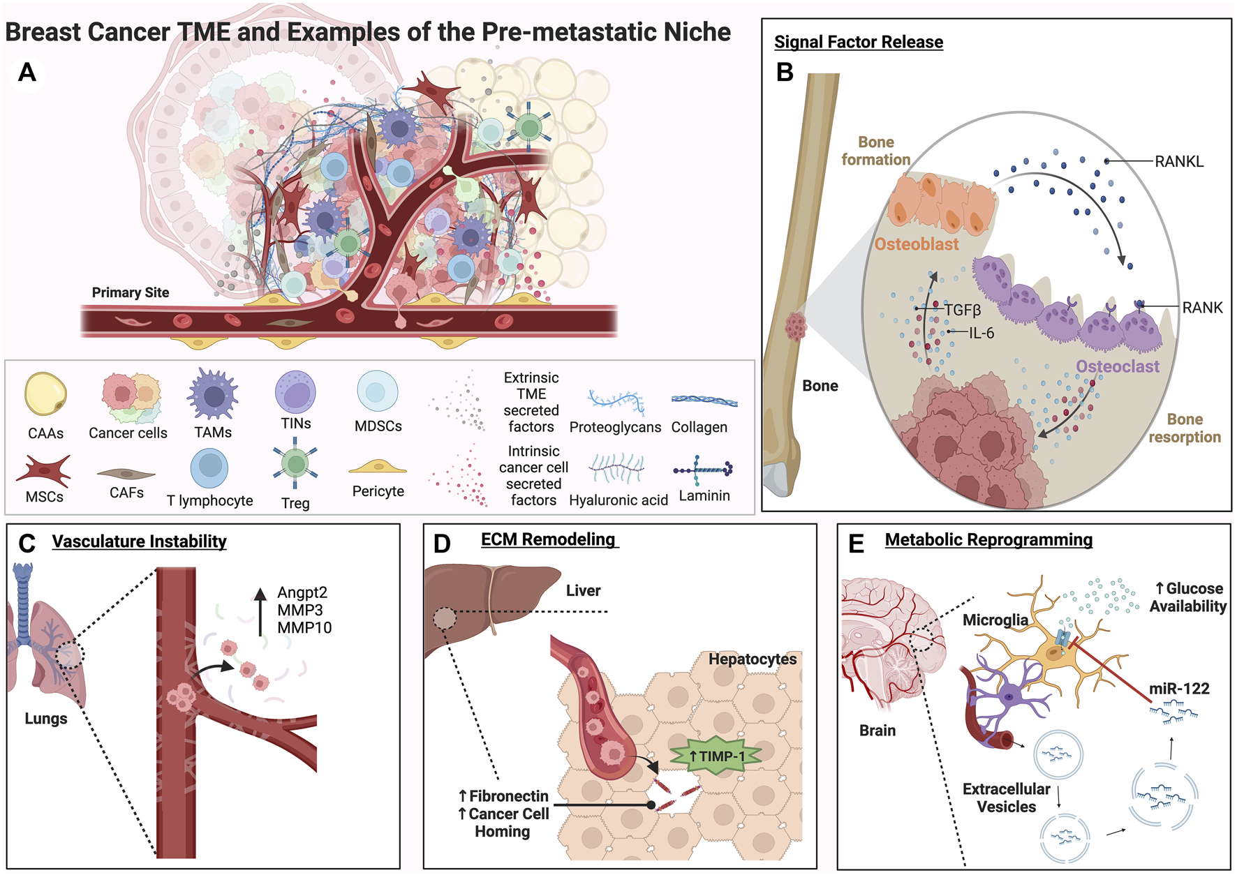 A complex roster of both tumor cell intrinsic and extrinsic cues within the TME can facilitate the formation of the pre-metastatic niche. Factors released from both tumor cells and the TME can activate signaling pathways involved in plasticity, proliferation, and migration within the primary tumor and distant secondary sites of metastasis. These examples represent some of the many ways secondary sites can be conditioned to form an ideal metastatic niche for disseminated tumor cells. (A) A graphical depiction of the primary tumor site showing the potential complexity of the breast cancer TME and key cell types that contribute to metastatic progression. (B) The bone metastatic niche is shown. The RANK/RANKL vicious cycle of bone formation and resorption is depicted in (B). Through this process, growth factors such as TGFβ and inflammatory cytokines like IL-6 are released, driving EMT and facilitating pre-metastatic niche formation in the bone. (C) Matrix metalloproteinases and vasculature remodeling factors expressed by tumor cells can contribute to vasculature instability and extravasation in the lungs. (D) In the liver, TIMP-1 secreted by hepatocytes can trigger remodeling of the ECM and homing of tumor cells to a fibronectin and TGFβ rich microenvironment (E). Extracellular vesicles containing the miRNA miR-122 secreted by tumor cells can travel through the vasculature to the brain, downregulating glucose uptake and creating a nutrient rich environment for metastases.