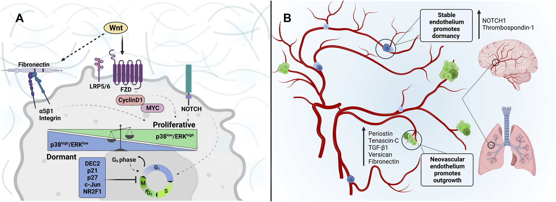 Dormancy and reawakening of cancer cells: Extracellular matrix cues associated with tumor cell entrance into and escape from dormancy within the metastatic niche. (A) Wnt-signaling through Frizzled and LRP5/6 receptors induces the expression of cyclin D1 and MYC, promoting G0-G1 transition and G1-S, S-G2, and G2-M cell cycles. Similarly, a fibronectin signaling axis activation through α5β1-integrins can be regulated by Wnt signaling to increase invasion and tumor outgrowth, while inhibition impedes stable adhesion and can sustain tumor dormancy. Such tumor microenvironment and ECM alterations can modulate mechanisms underlying dormancy state fate, such as p38/ERK signaling. The p38high/ERKlow ratio is associated with inducing G0-G1 growth arrest. While cancer cells with p38low/ERKhigh are highly proliferative. (B) The perivascular niche is depicted. The tumor-promoting nature of the sprouting microvasculature of the lung and brain is characterized by enhanced expression of matrix-associated factors such as Periostin, Tenascin-C, TGF-β1, Versican, and Fibronectin. DTCs that reside in the sprouting neovasculature are prompted to proliferate in response to this conducive niche. In contrast, the stable vascular endothelium is rich in NOTCH1 and Thrombospondin-1, promoting tumor-cell dormancy.