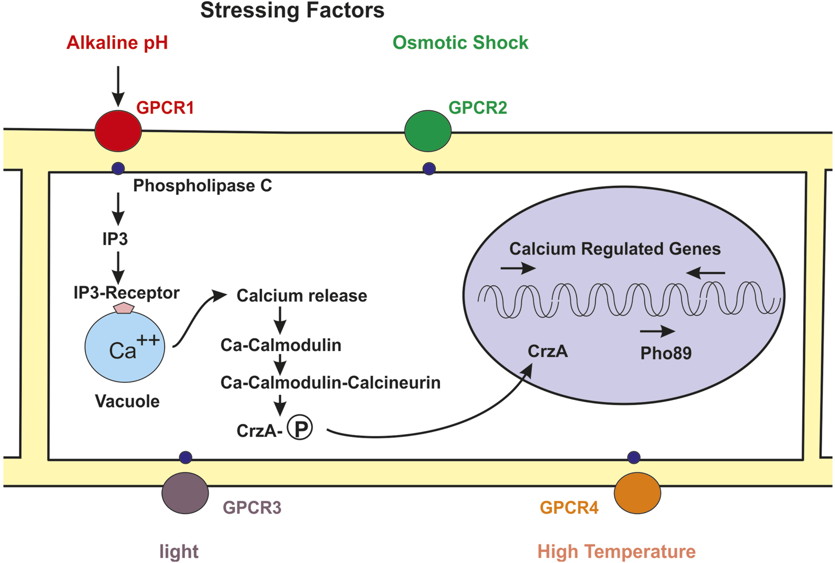 Skeme of the molecular mechanism of regulation of fungal metabolism by the calcium-calmodulin-calcineurin pathway. Numerous stressing signals interact with GPCRs receptors in the cell membrane (circles red, green, purple, orange). The GPCR bind to the phospholypase C (small blue circles) and this protein forms IP3. The binding of IP3 to its receptor in the vacuole (blue clear circle) membrane triggers the release of calcium to the cytosol. Free cytosolic calcium binds to calmodulin and the calcium-calmodulin complex activates the calcineurin phosphatase activity. The phosphatase activity removes phosphate from the phosphorylated Crz1 transcriptional factor and the unphosphorylated Crz1 protein enters into the nucleus (pink circle) and activates expression of the high affinity phosphate pho89 transport gene and of numerous genes regulated by calcium.