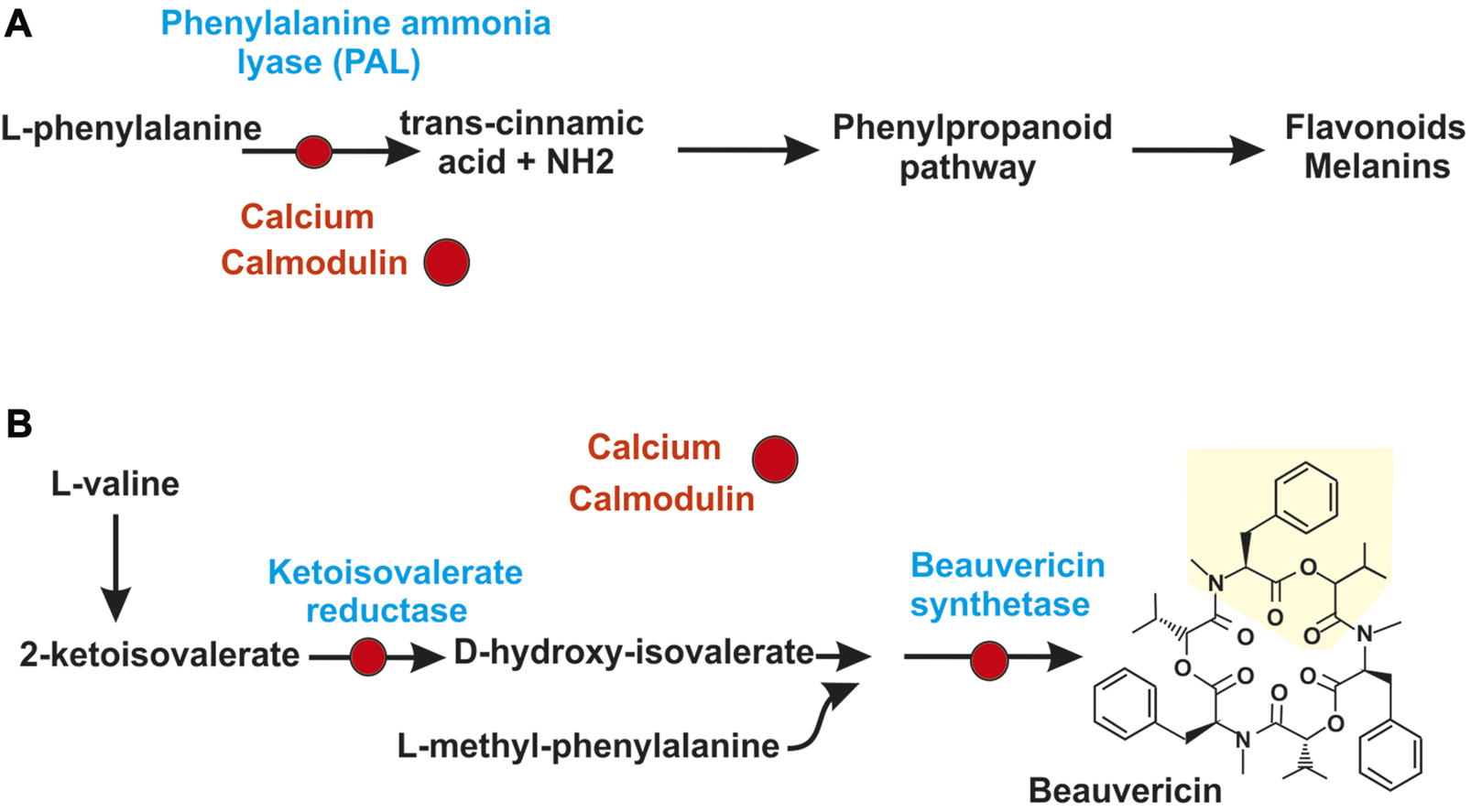 Calcium control of secondary metabolites by direct interaction of calmodulin with secondary metabolites synthesizing enzymes. (A) Regulation by calcium of the phenylpropanoid pathway. The calcium-calmodulin complex (red circles) binds and inactivate the phenylalanine ammonia lyase (PAL), first enzyme of the phenylpropanoid pathway. This inactivation blocks the pathway and the formation of secondary metabolites derived from it, as flavonoids and melanins. (B) Skeme of biosynthesis of beauvericin in Beauveria bassiana. The calcium-calmodulin complex (red circles) binds and inactivate: 1) the 2-ketoisovalerate reductase converting 2-ketoisovaleric acid in d-hydroxyisovalerate and 2) the non-ribosomal peptide synthetase of Beauveria bassiana that condenses three units of L-methyl-phenylalanine-d-hydroxyisovalerate depsipeptide to form beauvericin.