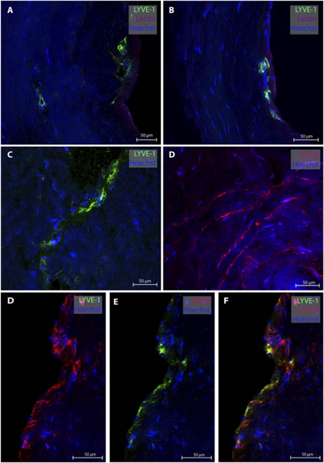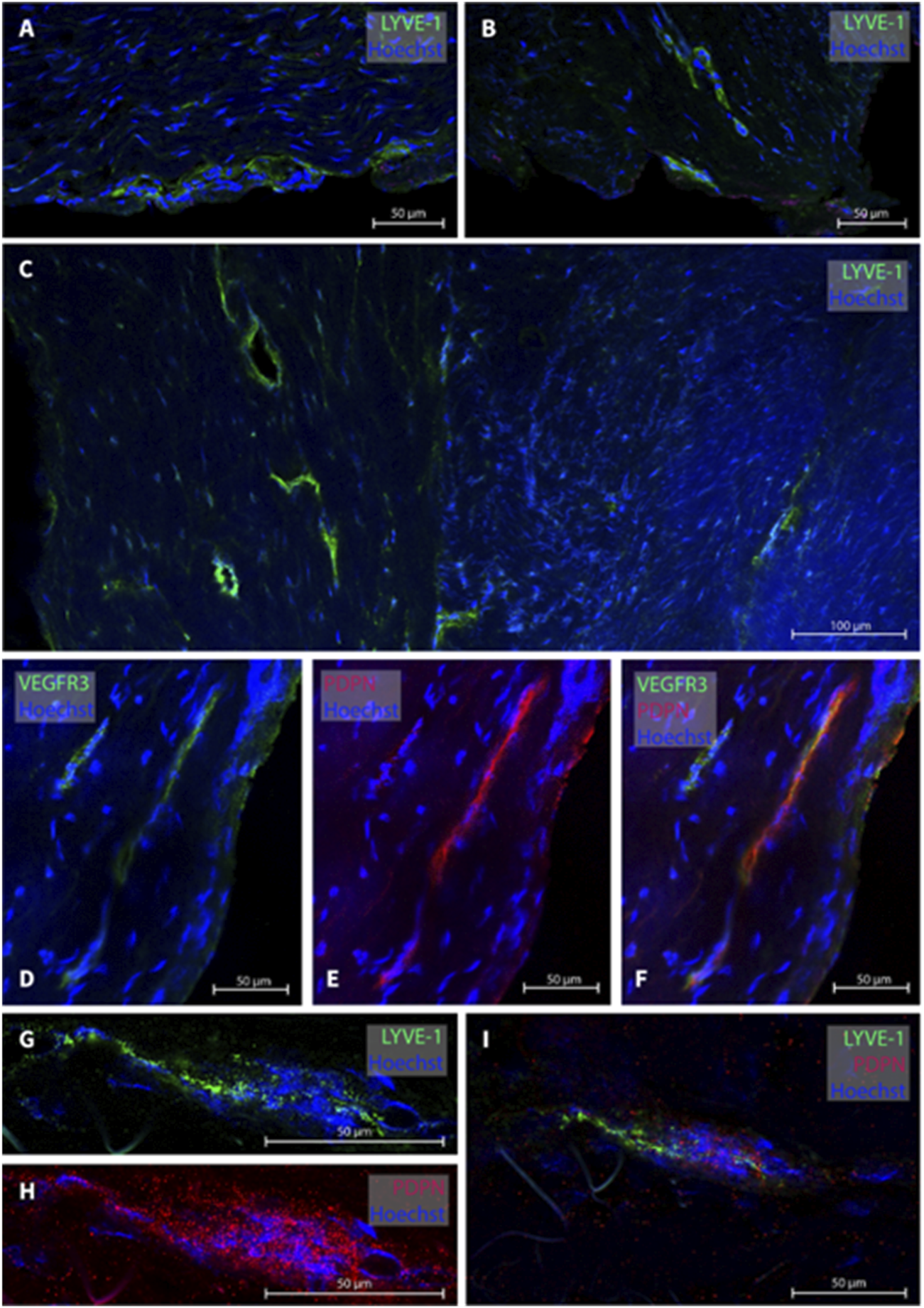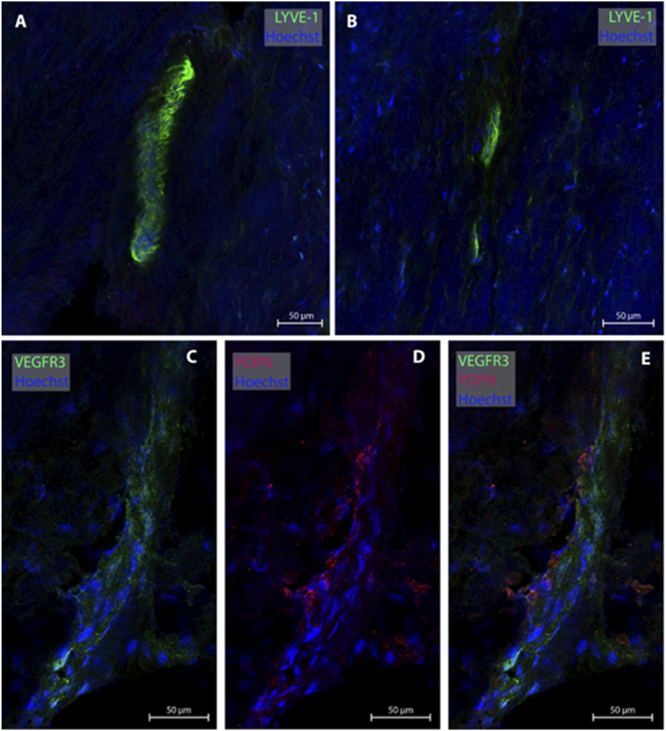 In all 15 subjects, lymphatic vessels were found labeled with either LYVE-1, VEGFR3 and/or PDPN.