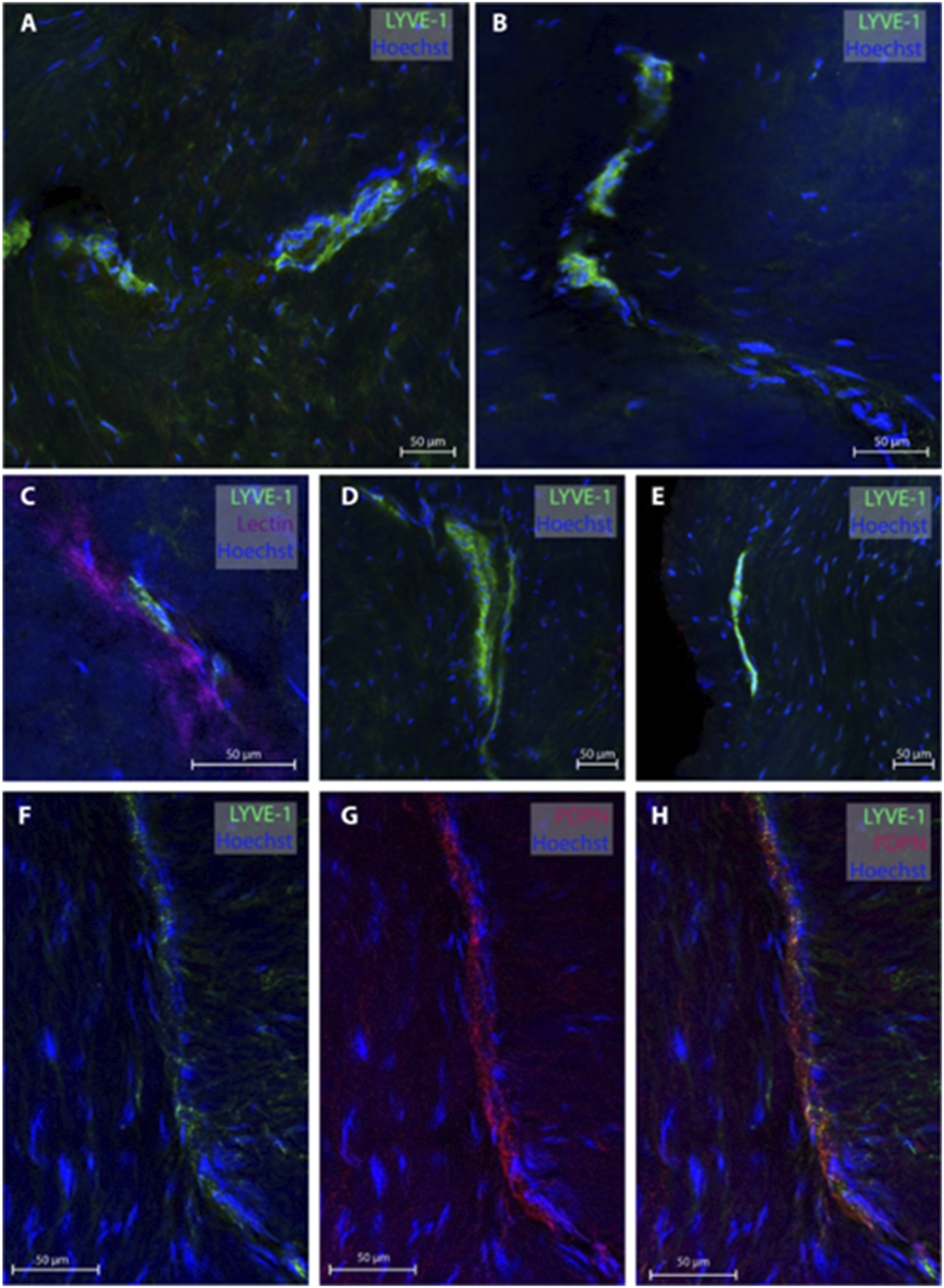 FIGURE 3. Lymphatic vessels in dura mater of temporal skull base. Representative images of lymphatic vessels in the temporal skull base region labeled with LYVE-1. Panels (A, D, E) are sections from patient #4, panel (B) from patient #3 and panel (C) from patient #2. In Panel C, the lymphatic vessels can be seen next to a lectin-labeled blood vessel. Panels (F–H) are a lymphatic blood vessel co-labeled with LYVE-1 and PDPN from patient #3.