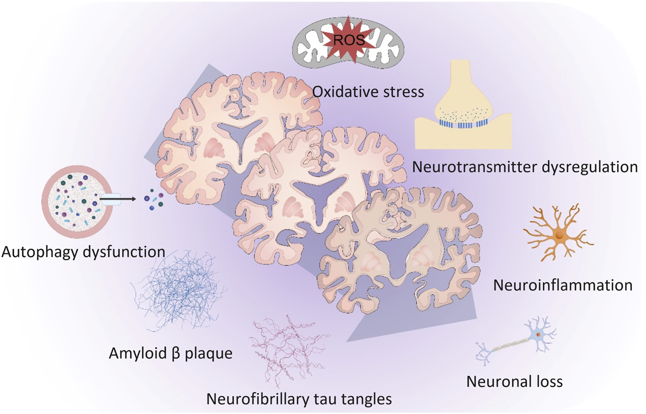 The principal factors responsible for the progression of Alzheimer’s disease. Amyloid-β plaques, neurofibrillary tau tangles and microglia-activated neuroinflammation are considered the three major pathological hallmarks of Alzheimer’s disease. Other important factors related to Alzheimer’s disease were oxidative stress, neurotransmitter dysregulation, autophagy dysfunction and neuronal loss.