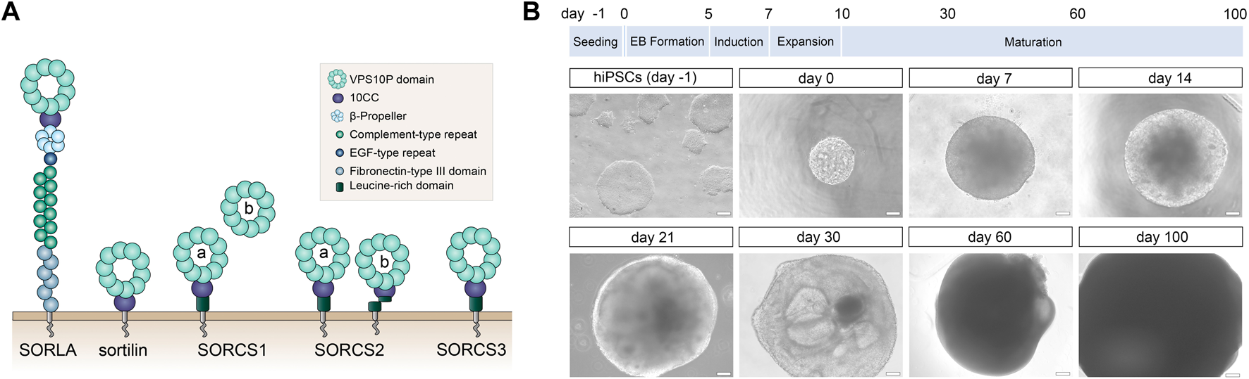 To interrogate expression of VPS10P domain receptors during human brain development and in adult function, we modified published protocols for efficient and reproducible generation of cerebral organoids from human iPSC lines (see methods for details). Our protocol follows a time line of seeding of iPSCs, formation of embryoid bodies (EB), and subsequent maturation of the organoids for up to 100 days (Figure 1B). Cerebral organoids were chosen based on databases suggesting expression of all VPS10P domain receptors in the human brain cortex (https://www.proteinatlas.org).
