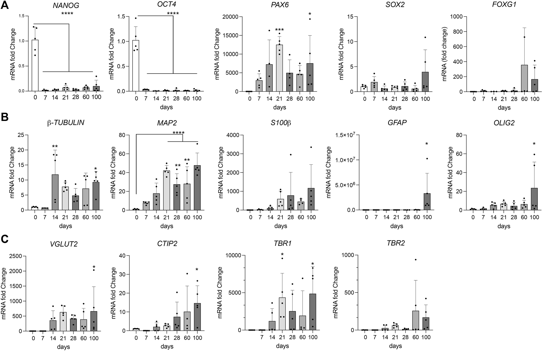 Marker gene transcription during organoid maturation Transcript levels for the indicated marker genes were determined by quantitative (q) RT-PCR in cerebral organoids at various timepoints of differentiation. In (A) stem cells and progenitor markers, in (B) mature neural markers; in (C) markers for different neuron subtypes. Data are given as changes relative to transcript levels in embryoid bodies (day 0 of differentiation set to 1). Statistical significance of data was determined by one-way ANOVA followed by Dunnett’s multiple comparisons tests. n = 3–5 organoids per condition (each organoid from an independent differentiation experiment); *, p < 0.05; **, p < 0.01; ***, p < 0.001; ****, p < 0.0001.