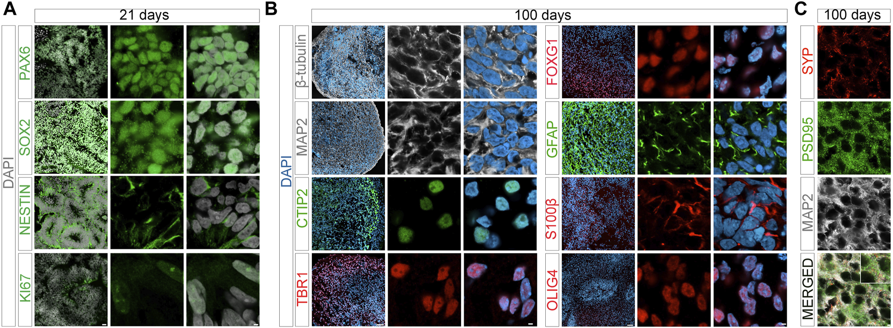 During maturation, cerebral organoids showed the expected decrease in pluripotency markers NANOG and OCT4, and a corresponding induction of genes in early telencephalic development, including PAX6 and SOX2, and an increase in the forebrain marker FOXG1 (Figure 2A). From day 14 onwards, marker gene expression indicative of neural development, including pan-neuronal markers TUBB and MAP2, as well as neuroepithelial marker S100β was apparent. Expression of non-neuronal cell markers GFAP (astrocytes) and OLIG2 (oligodendrocytes) was seen in mature organoids around 100 days of age (Figure 2B). Markers of cortical specification appeared around day 21, including TBR2 (cortical neurogenesis), VGLUT2 (glutamatergic neurons), as well as CTIP2 and TBR1 (cortical neurons layers V and VI) (Figure 2C). Induction of neurogenesis in proliferating progenitor populations was corroborated by immunohistological detection of lineage markers PAX6, SOX2, and nestin, as well as proliferation marker KI67 in day 21 organoids (Figure 3A). Subsequent formation of neuronal and non-neuronal cell types was confirmed by immunostaining for β-tubulin, MAP2, TBR1, CITP2, and FOXG1, as well as for GFAP, S100β, and OLIG4, respectively (Figure 3B). Colocalization of immunosignals for the pan-neuronal marker MAP2 with proteins indicative of pre- (synaptophysin, SYP) and post-synaptic (PSD95) compartments documented the formation of synapses by day 100 of organoid differentiation.