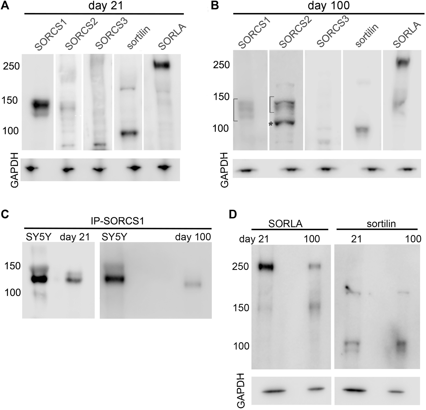 Expression of VPS10P domain receptors in cerebral organoids during maturation (A,B) Expression of VPS10P domain receptors was tested in membrane protein preparations from cerebral organoids at day 21 (A) and at day 100 (B) of differentiation using Western blotting. In B, brackets indicated the range of migration of various isoforms of SORCS1 and SORCS2 (130–150 kDa). The asterisk denotes the 104 kDa amino terminal fragment of the two-chain form of SORCS2 (104 kDa). Detection of GAPDH served as loading controls. (C) The soluble ectodomain of SORCS1 (approx. 120 kDa). was recovered by immunoprecipitation (IP-SORCS1) from soluble protein extracts of cerebral organoids at day 21 and day 100 of differentiation. The SORCS1 ectodomain recovered by IP from the cell supernatant of the neuroblastoma cell line SY5Y is shown as positive control. (D) Immunodetection of shedded ectodomains of sortilin (approx. 80 kDa) and SORLA (approx. 230 kDa) in soluble protein extracts from organoids at day 21 or day 100 of differentiation. For all panels, the migration of marker proteins of the indicated molecular weights in kDa are given.