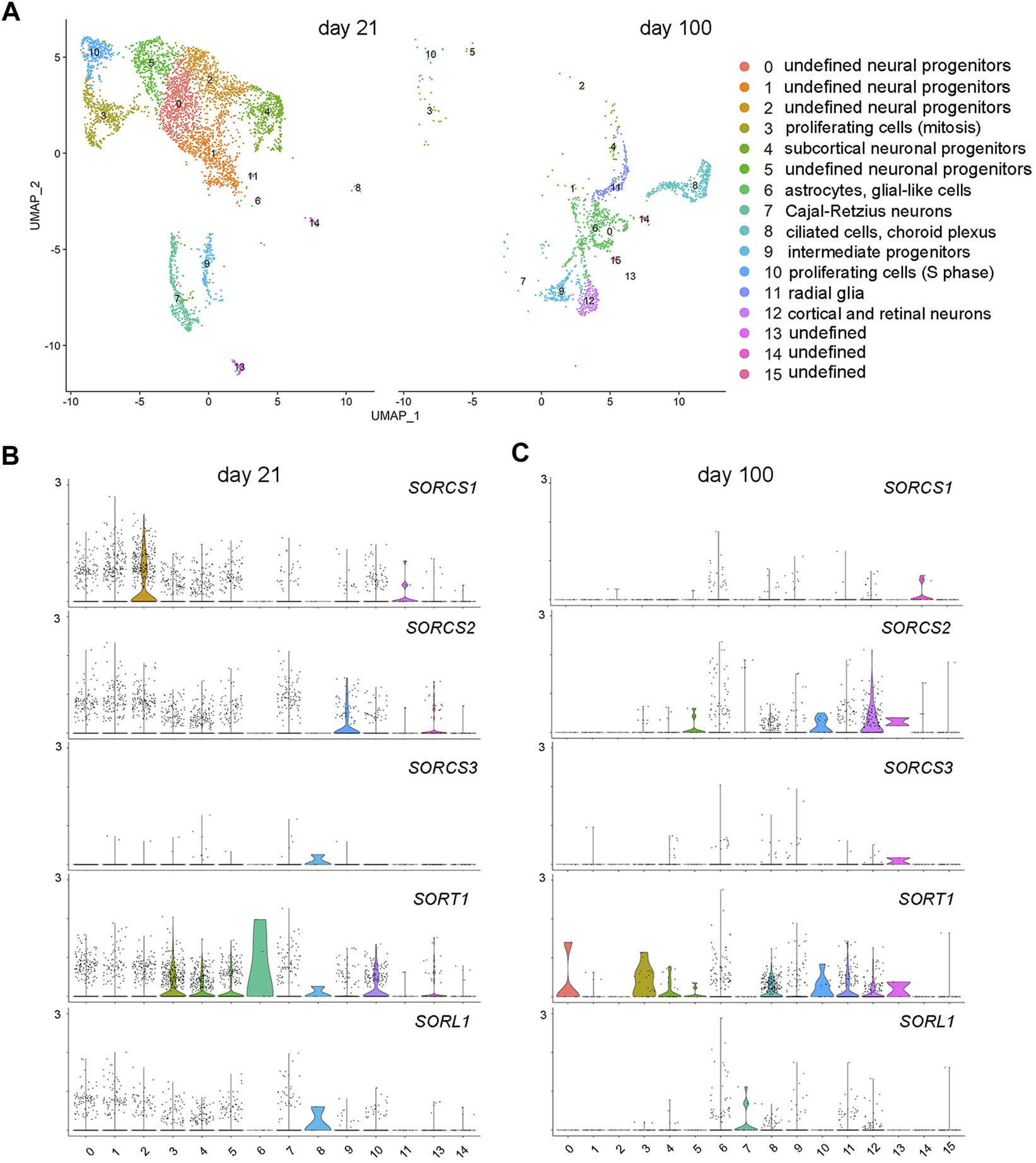 To explore the cell-type specific expression of VPS10P domain receptors in cerebral organoids, we performed single-cell RNA sequencing (scRNAseq) in organoids at day 21 and day 100 of differentiation. Day 21 was chosen for early organoid development as it represented the time of peak expression of SORCS1. While scRNAseq of early organoids pose few technical challenges, analysis of mature organoids tends to be more difficult, due to their larger size and their necrotic core, hampering the generation of high-quality single-cell suspensions. To address these technical obstacles, we developed novel protocols to generate single-cell suspensions from 100 days old organoids with a reproducible cell viability of approximately 80% (see methods for details). Analysis of the combined single-cell transcript datasets of 21 days and 100 days old organoids by unsupervised clustering, and visualized using Uniform Manifold Approximation and Projection for dimension reduction (UMAP) plot, identified 16 distinct cell clusters (Figure 6A; Supplementary Figure S1). Recapitulating brain development, 21 days old organoids were characterized by large clusters of neural progenitors (clusters 0, 1, 2) as well as neuronal and subcortical neuronal progenitors (clusters 4 and 5). Also, clusters of proliferating cells in S-phase (cluster 10) or mitosis (clusters 3), as well as intermediate progenitors (cluster 9) and Cajal-Retzius neurons (cluster 7) were identified at this stage. In mature organoids (day 100), clusters of various progenitors and proliferating cells had largely disappeared. Instead, cell types indicative of further cortical specification were evident, including intermediate progenitors (cluster 9) as well as cortical and retinal neurons (cluster 12). Radial glia (cluster 11), astrocytes (cluster 6), and ciliated cells of the choroid plexus (cluster 8) were non-neuronal cell types identified at day 100.