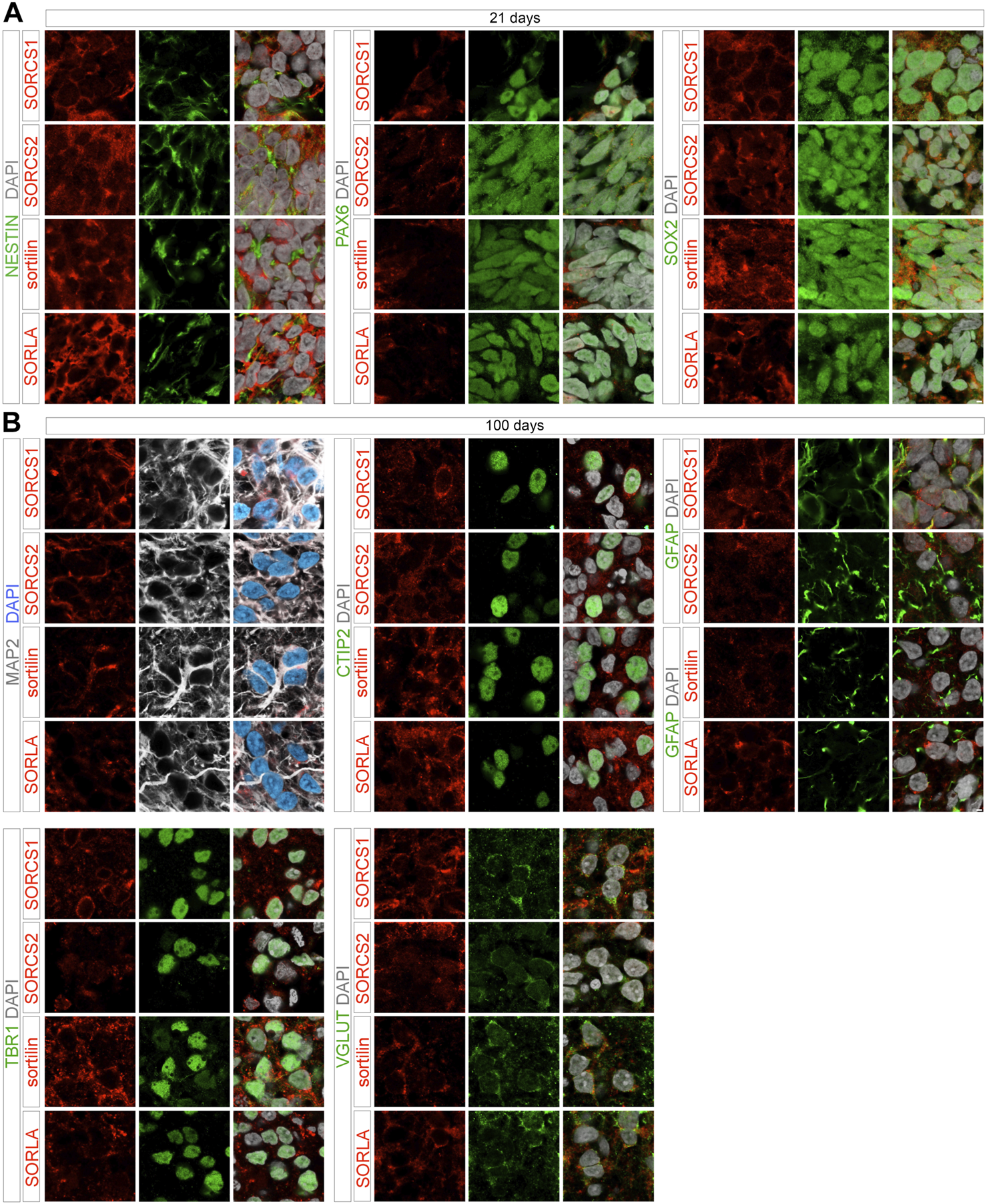 Cell-type specific expression of VPS10P domain receptors in 21 and 100 days old organoids. Immunohistological detection of the indicated VPS10P domain receptors in 21 days (A) or 100 days (B) old cerebral organoids. Cell-type specific expression of the receptors (red) was tested by colocalization with the indicated cell markers (green, grey). Single (left, middle) as well as merged channel configurations with DAPI counterstain (right) are shown. Scale bars: 2 μm.