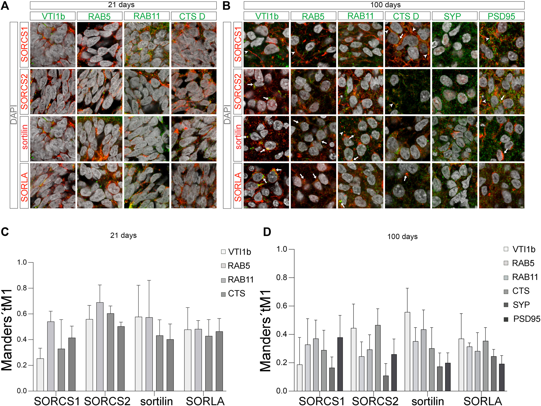 VPS10P domain receptors act as sorting factors that move target proteins to their destined location within cells. To perform this task, the receptors, and their bound cargo, follow a complex trafficking path between Golgi, cell surface, and endocytic compartments (Malik and Willnow, 2020). To interrogate distinct subcellular localization patterns in human neurons, we co-immunostained VPS10P domain receptors with markers of various intracellular compartments in 21 days and 100 days old organoids. Because of a general absence of SORCS3 from cerebral organoids, we focused our analyses on SORCS1, SORCS2, SORLA, and sortilin.