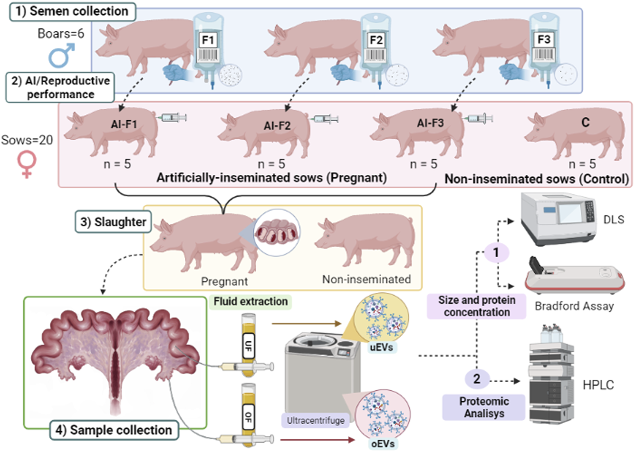 Diagram of the experimental design. 1) Semen samples were collected from six different boars and prepared as three types of ejaculate accumulative fractions: F1, composed of the rich-sperm fraction (SRF); F2, composed of the F1 plus the intermediate fraction; and F3, composed of F2 plus the post-SRF. 2) Artificial insemination (AI) was performed: Four experimental groups of sows (n = 5 sows/group) were inseminated with a type of AI dose (AI-F1, AI-F2, and AI-F3) or non-inseminated (C). 3) Sows were slaughtered on day six post-AI, and female genital tracts were collected and identified according to the experimental group they belonged. 4) Sampling of the female genital tracts: Oviductal and uterine flushing’s were extracted for the isolation of extracellular vesicles (EVs) by ultracentrifugation, characterization analysis of the size distribution by dynamic light scattering, and determination of the protein concentration by the Bradford assay (protein concentration). The protein quantification of EVs from the oviductal fluid (oEVs) and uterine fluid (uEVs) were evaluated by HPLC/MS-MS.