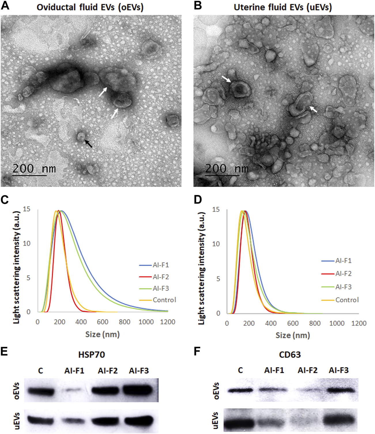 Characterization the extracellular vesicles’ size from oviductal fluid (oEVs) and uterine fluid (uEVs). (A) Transmission electron microscopy (TEM) of oEVs after the OF ultracentrifugation. (B) Transmission electron microscopy (TEM) of uEVs after the UF ultracentrifugation. Concentration of uEVs was higher than oEVs, independently of the type of AI-dose inseminated (F1, F2 or F3). Arrows indicate the cup-shaped morphology of EVs. (C) Graphical distribution of the oEVs by size and sow depending on the type of AI-dose inseminated (AI-F1, AI-F2, or AI-F3) or non-inseminated (control, C). (D) uEVs populations by size and sow depending on the experimental group (AI-F1, AI-F2, AI-F3, or C). (E) EVs protein marker HSP70 in the experimental groups (AI-F1, AI-F2, AI-F3, or C). (F) EVs protein marker CD63 in the experimental groups (AI-F1, AI-F2, AI-F3, or C).