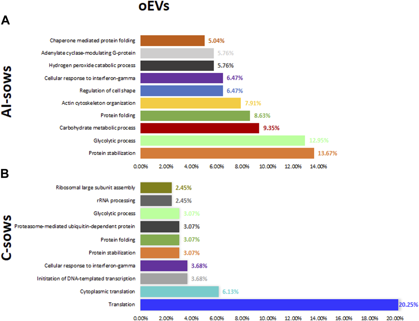 Biological processes and the percentage of extracellular vesicles detected in oviductal fluid (oEVs) in (A) artificially inseminated sows (AI-sows) and (B) non-inseminated sows (control, C-sows).