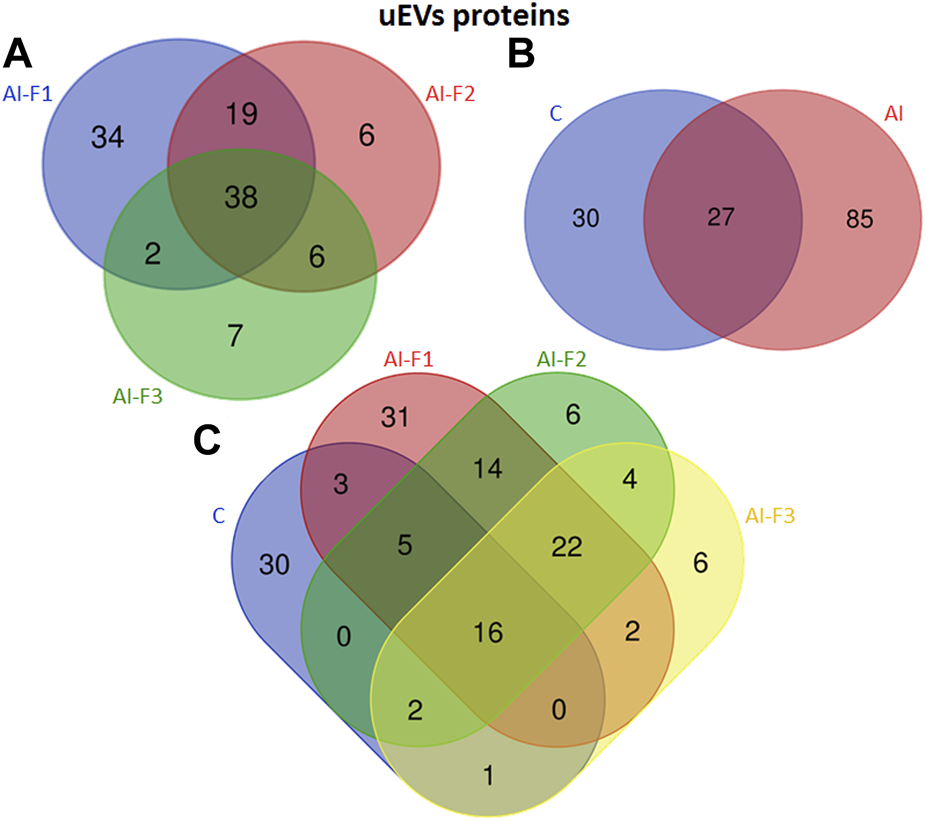 Venn diagram illustrating the number of different proteins from extracellular vesicles of uterine fluid (uEVs) in sows (n = 20) inseminated with different semen doses from boars (n = 6) according to the seminal fraction(s) used for artificial insemination (AI): F1, composed by the sperm-rich fraction (SRF); F2, composed by F1 plus the intermediate fraction; F3, composed by F2 plus the post-SRF. Non-inseminated sows were considered as control (C). (A) The overlap of uEVs proteins from AI-F1, AI-F2, and AI-F3 sows. (B) The overlap of uEVs proteins of AI- and non-inseminated sows (control, C). (C) The overlap of uEVs protein in all the experimental groups.