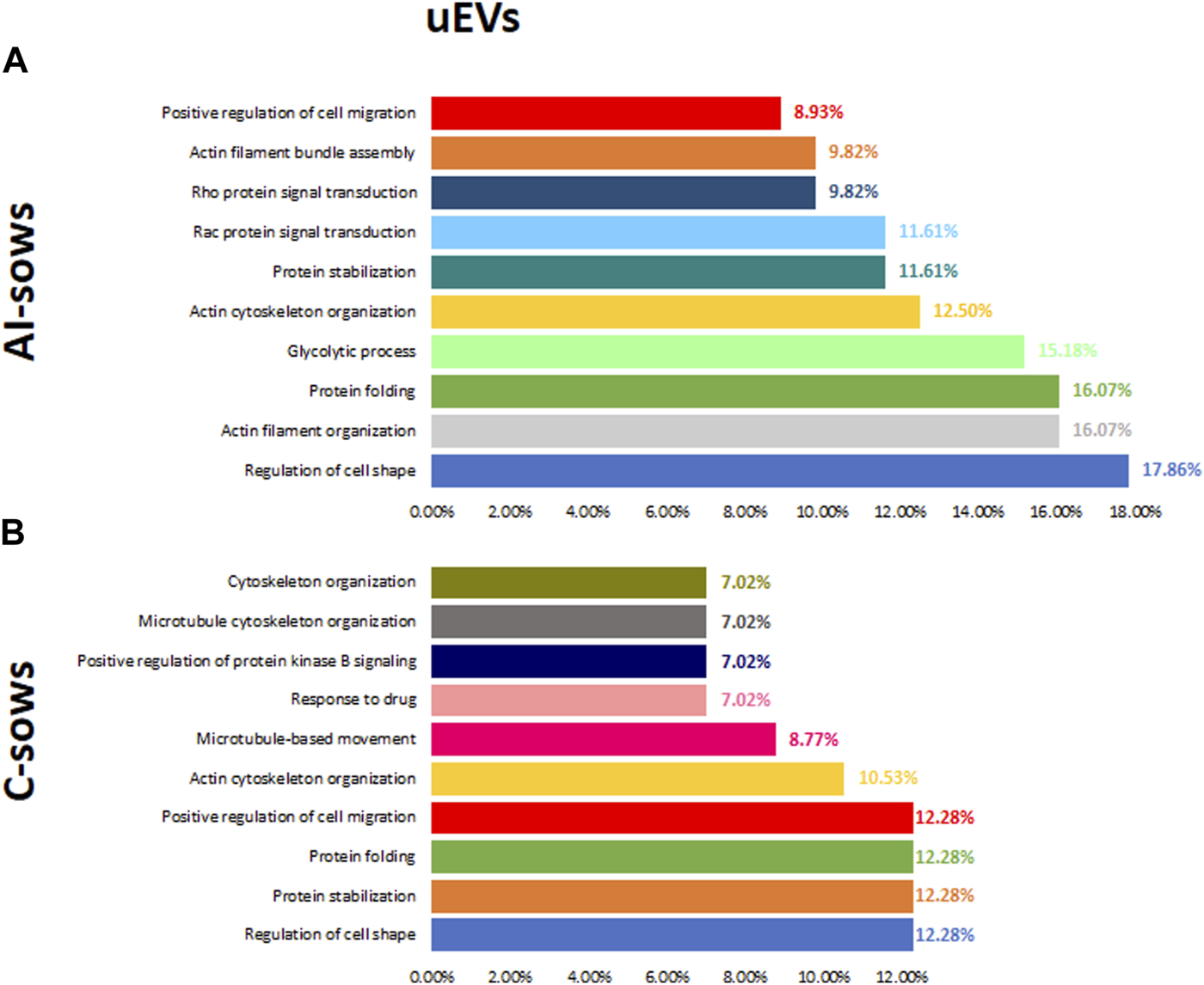 Biological processes and the percentage of extracellular vesicles detected in uterine fluid (uEVs) in (A) artificially inseminated sows (AI-sows) and (B) non-inseminated sows (control, C-sows).