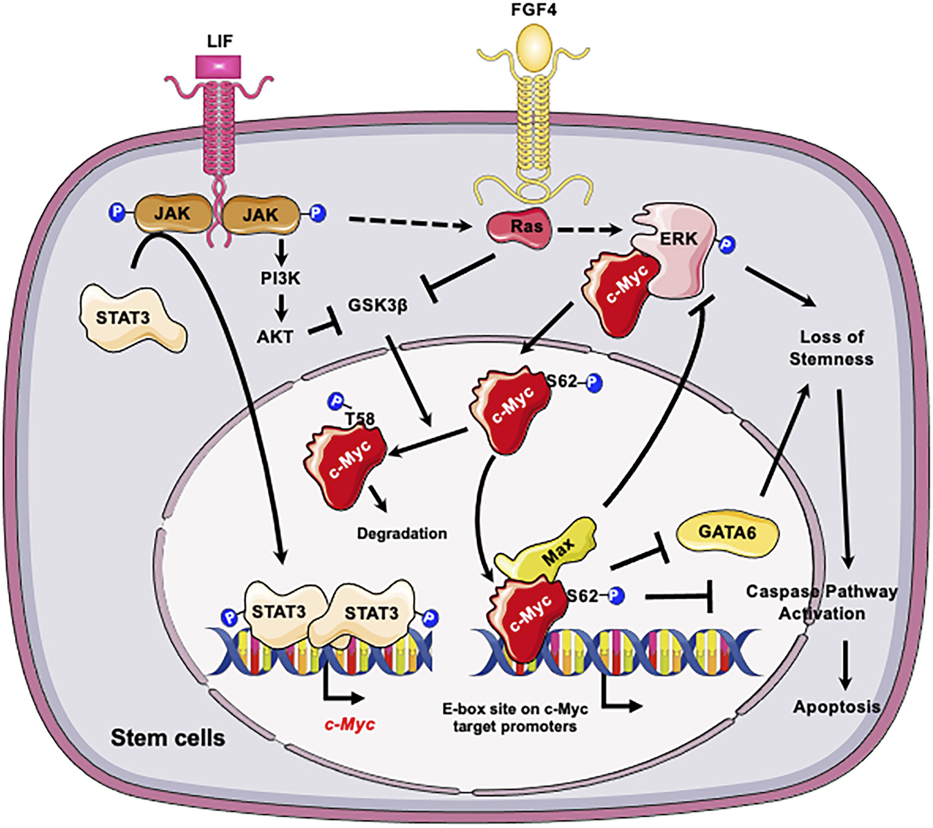 At the molecular level, c-Myc is important for maintaining self-renewal and pluripotency of mESCs by interacting with leukemia inhibitory factor (LIF)/Signal transducer and activator of transcription 3 (STAT3) signal pathway (Cartwright et al., 2005). Specifically, LIF actives c-Myc via two mechanisms (Figure 1): elevates the transcription of c-myc through the Janus kinase (JAK)-STAT3 pathway and prevents GSK3β-mediated phosphorylation of c-Myc T58 and subsequent degradation (Cartwright et al., 2005). Moreover, the stability of c-Myc is sensitive to growth factors such as fibroblast growth factor 4 (FGF-4), which activates extracellular signal-regulated kinase (ERK1/2), a mitogen-activated protein kinase (MAPK). ERK phosphorylates c-Myc at Ser 62, leading to its stabilization (Sears et al., 2000; Lee et al., 2008; Ying et al., 2008). The phosphorylated c-Myc then interacts with Myc-associated protein X (Max) to form a heterodimer complex. This complex then binds to the “E-box” sequence in the target gene promoter region, thereby activating or repressing the transcription of target genes (Yoshida, 2018). Importantly, the c-Myc/Max heterodimer complex acts as a central node of the regulatory network which prevents loss of stemness of mESCs and subsequent apoptosis (Figure 1). Firstly, this complex inhibits the p-ERK, which forms a negative feedback loop to prevent the MARK signaling induced loss of stemness (Hishida et al., 2011). Secondly the c-Myc/Max complex can directly suppress expression of primitive endoderm master regulator, GATA6, to maintain stemness (Smith et al., 2010). Consistently, depletion of Max gene in mESCs results in loss of the undifferentiated state, upregulation of linage markers, and induction of apoptosis/death with Caspase-3 activation (Hishida et al., 2011). All these are primarily caused by activation of MAPK signaling, because inhibiting MAPK kinase signaling significantly blocks the decline of pluripotency genes and eliminates differentiated cells (Hishida et al., 2011).