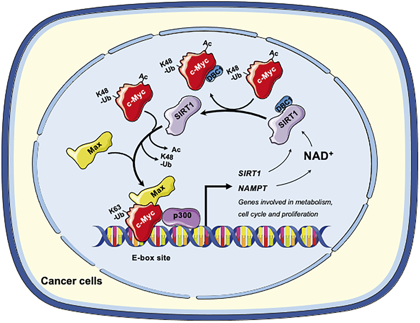 FIGURE 2. The SIRT1-c-Myc positive feedback loop in cancer cells. SIRT1-mediated deacetylation of c-Myc increases its binding affinity to Max. Deacetylation of c-Myc by SIRT1 also increases K63-linked polyubiquitination while repelling degradative K48-linked polyubiquitination, enhancing the stability of c-Myc and increasing recruitment of p300. Both mechanisms facilitate the transactivation of c-Myc target genes, including genes involved in metabolism, cell cycle and cell proliferation. Conversely, c-Myc also enhances the activity of SIRT1. Firstly, c-Myc increases the cellular NAD+ by transcriptional activation of NAMPT, the rate-limiting enzyme in the amidated NAD+ salvage pathway. Increased NAD+ enhances the deacetylase activity of SIRT1. Secondly, c-Myc sequesters the SIRT1 inhibitor DBC1, thereby increasing SIRT1-substrate interaction. Finally, c-Myc directly increases the transcription of SIRT in p53 deficient cells. Figures were created using images downloaded and adapted from Service Medical ART: SMART (https://smart.servier.com/image-set-download/). Servier Medical Art by Servier is licensed under a Creative Commons Attribution 3.0 Unported License (https://creativecommons.org/licenses/by/3.0/).”