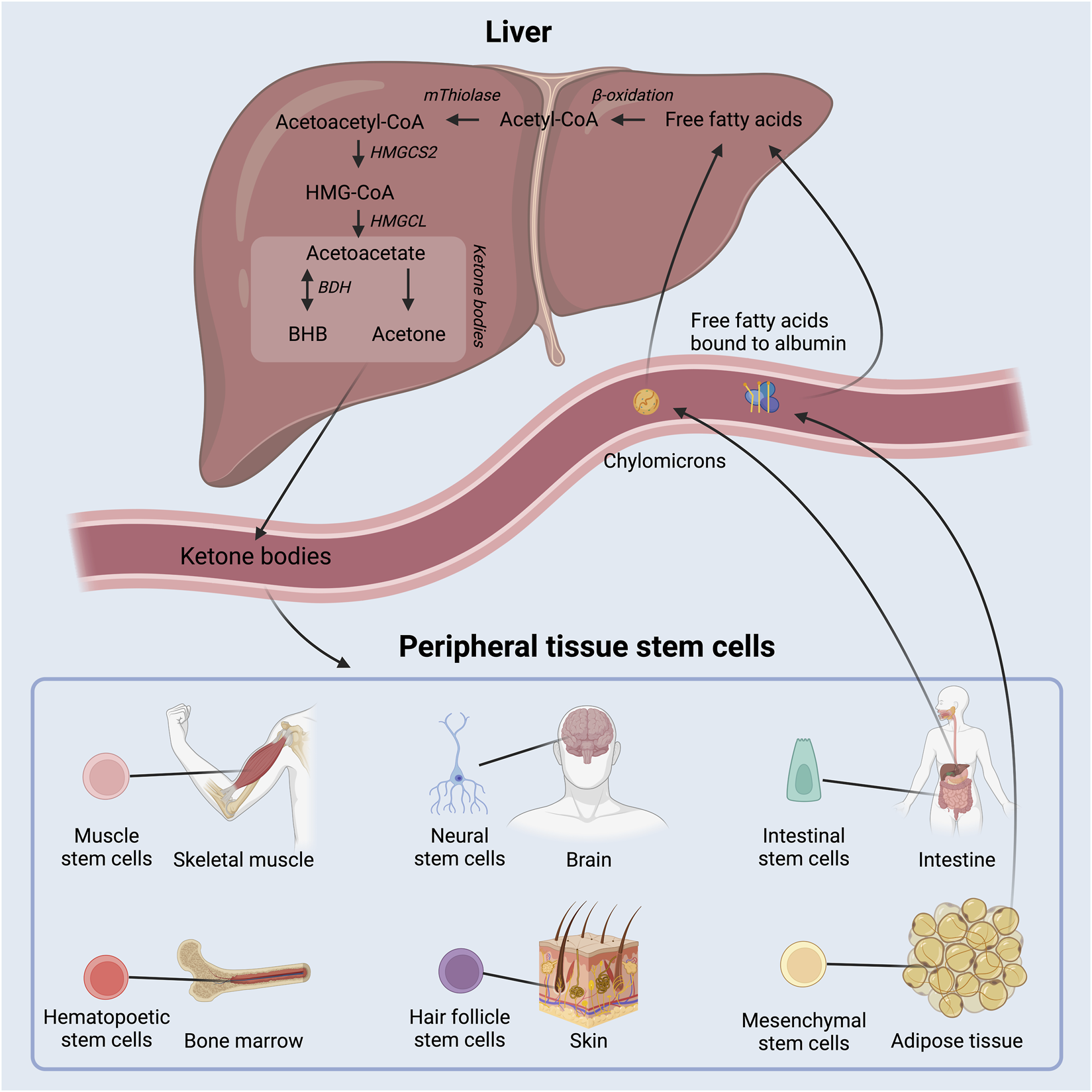 FIGURE 1. Schematic overview of ketone body production in the liver out of free fatty acids and delivery to peripheral tissue, where they act as energy substrates and signaling molecules. Adult stem cell populations residing in peripheral tissues can take up the circulating ketone bodies. BHB: beta-hydroxybutyrate; HMGCS2: 3-hydroxy-3-methylglutaryl-CoA synthase 2; HMGCL: 3-hydroxy-3-methylglutaryl-CoA lyase; BDH: beta-hydroxybutyrate dehydrogenase.