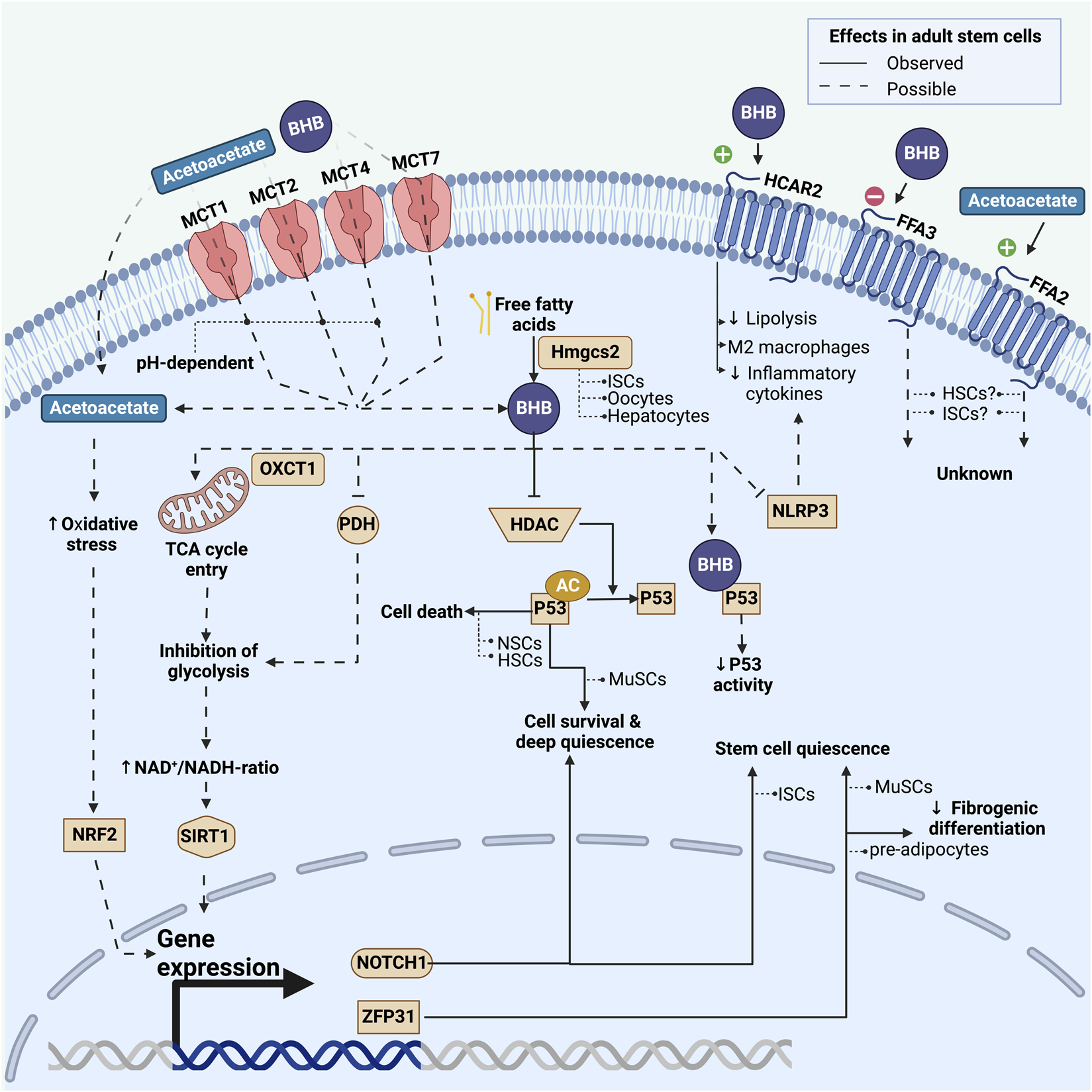Ketone bodies can also influence the acetylation of soluble proteins. The protein p53 (TP53)—often described as the “guardian of the genome”—plays a pivotal role in maintaining the integrity of DNA and preventing genomic instability (Lambrus et al., 2015; Eischen, 2016). Multiple quiescent stem cell types express p53 at high levels (Meletis et al., 2006; Liu et al., 2009; Liu et al., 2018). In both MuSCs (Benjamin et al., 2022) and hepatocytes (Roberts et al., 2018) p53 can be acetylated and thereby activated by ketone bodies. The protein p53 helps to maintain stem cell quiescence and prevent stem cell exhaustion, thereby serving as a quality control mechanism. Germline deletion of p53, for example, results in increased stem cell proliferation and decreased apoptosis in NSCs (Meletis et al., 2006) and HSCs (Liu et al., 2009) (Figure 2). However, the relationship between p53 and stem cell function is not straightforward: In MuSCs acetylated p53 promotes a deep quiescence and a resilient stem cell state (Benjamin et al., 2022). The importance of p53 for MuSC function is underlined by findings in mice where stabilization of p53 promoted stem cell survival (Liu et al., 2018). The effects of ketone bodies on p53 activation remain an underexplored area in most types of adult stem cells. Considering p53’s varied roles and its specific effects on different tissues and cell types, its interaction with ketone bodies could lead to varied responses in different stem cell populations.