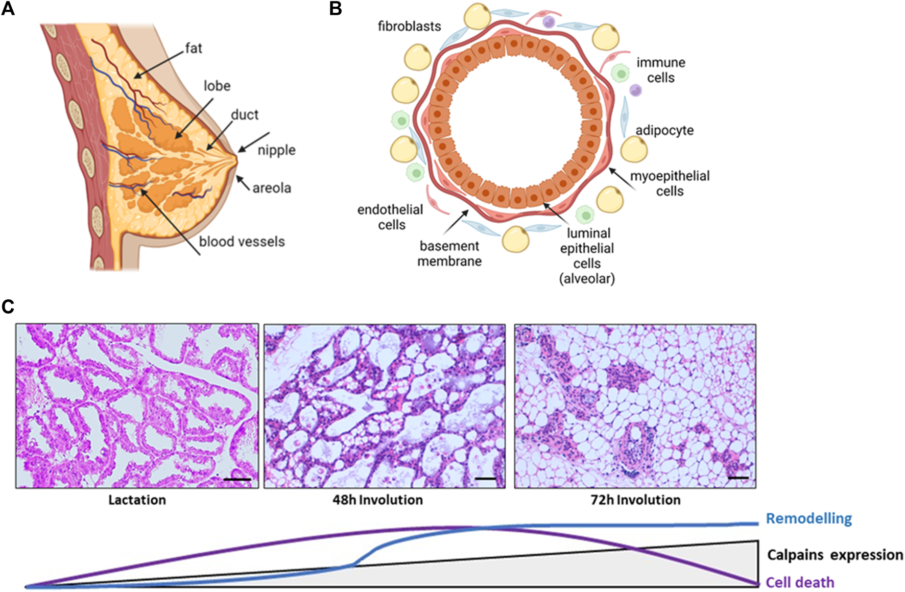 Schematic representation of the structure and morphological changes in the mammary tissue. (A) Normal breast anatomy (B) Alveolar structure of the gland. Polarized secretory epithelial cells form the lumen of the alveoli and are stretched by contractile myoepithelial cells and basement membrane. Surrounding these glandular structures, the mammary stroma is mainly formed by extracellular matrix, adipocytes, fibroblast, macrophages, and endothelial cells. (C) H&E stained sections of lactating and involuting mice mammary gland. The progression of epithelial cell death and remodeling is represented together with the levels of calpains expression. Lactating tissue shows the glandular structure, with several ducts and alveoli tightly closed together, surrounded by extracellular matrix, blood vessels and residual adipocytes. At 48 h weaning, alveoli start to collapse and detached epithelial cells are shed into the lumen. Collapse of alveoli progresses and at 72 h of involution the glandular structures are reduced and adipocytes repopulate the mammary fat pad. Scale bar: 250 μm.