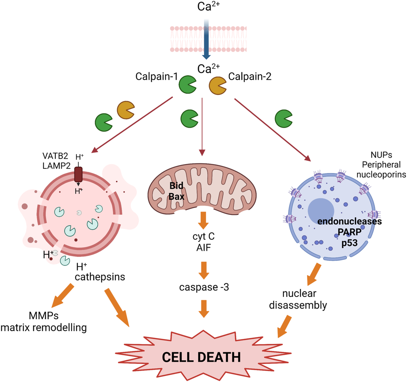 Activated calpains trigger cell death during the weaning process. Upon calcium overload, calpains become activated and translocate to different subcellular organelles where they cleave target proteins, inducing nuclear, lysosomal, and mitochondrial membrane destabilization, the release of cathepsins and pro-apoptotic proteins, and prompting cell death.