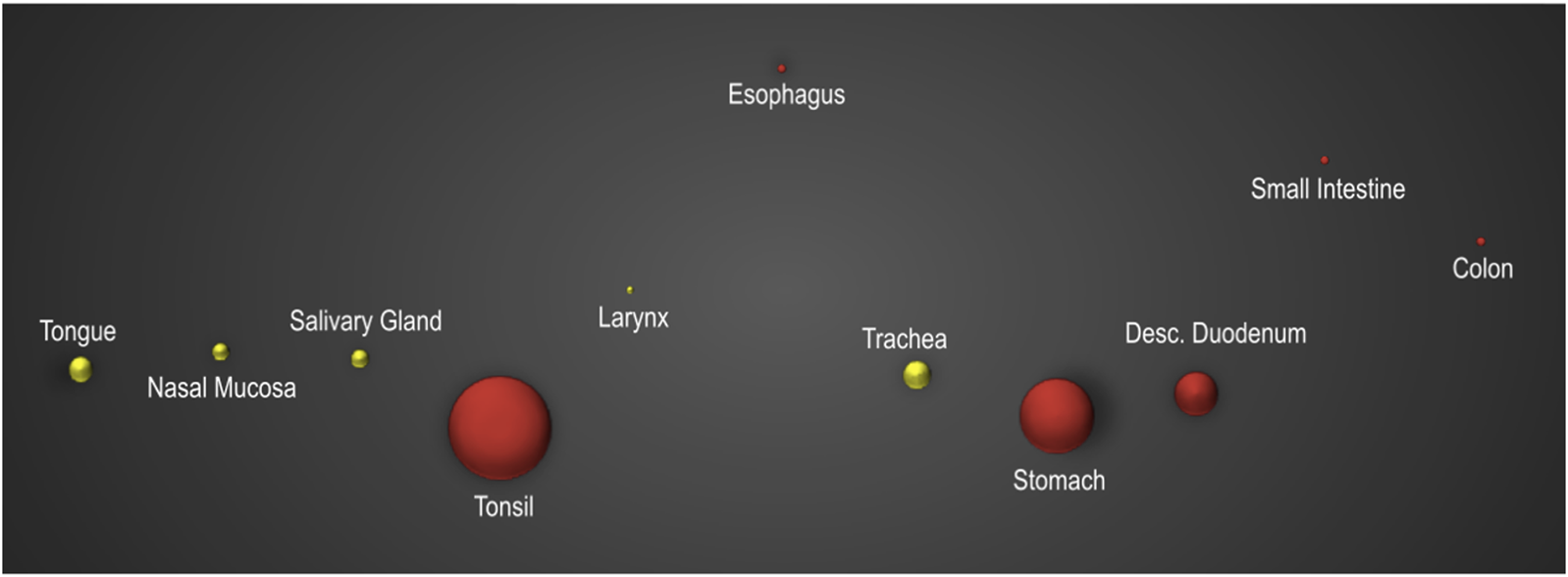 qRT-PCR analysis of various oral and GI tract tissues: a commercial cDNA array containing human tissue samples from the oral and gastrointestinal (GI) tract tissue was employed as the basis for a quantitative real-time polymerase chain reaction (qRT-PCR) analysis to assess the mRNA levels of AMBN across a spectrum of tissues within these anatomical regions. In the graphical representation of the data, bubbles indicate the calculated 2^-(∆∆CT) values, normalized to the expression of the housekeeping gene GAPDH. The PCR confirmed AMBN expression in tonsils, esophagus, stomach, and intestine (in red) and further showed that it is abundantly expressed in the human tongue, nasal mucosa, salivary glands, larynx, and trachea (as shown in the yellow bubbles).