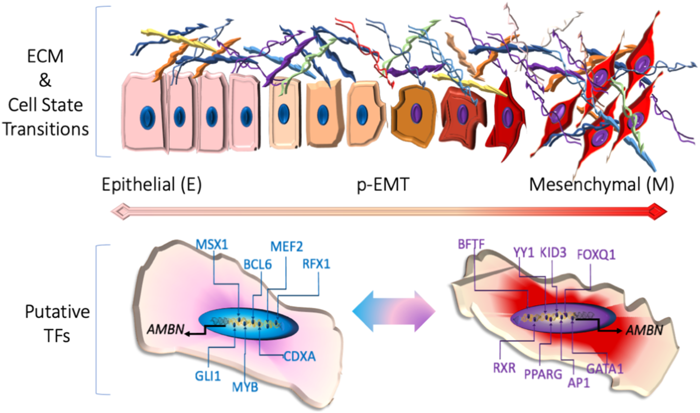 Upper panel: cellular changes during epithelial-to-mesenchymal transition (EMT). Lower panel: putative transcription factors (TFs) and/or promoter elements related to GI tract (left) and EMT (in purple font) AMBN transcription regulation.