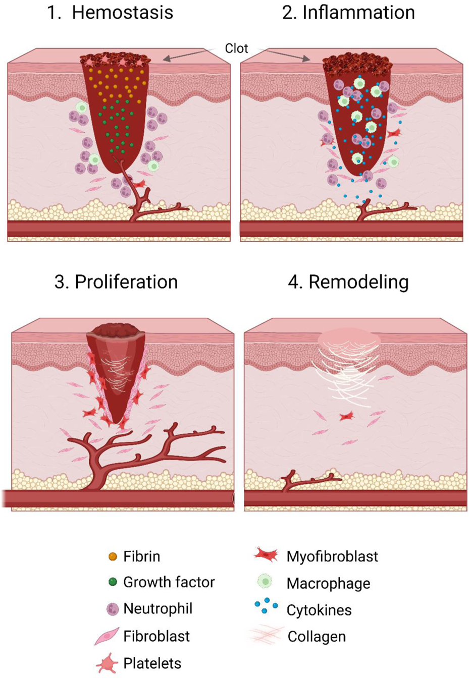 In the haemostasis phase, which occurs immediately after wounding, platelets are recruited to the wound site and aggregate, leading to clot formation and vasoconstriction. Platelets here require mitochondria for both activation and metabolic activities (Baccarelli and Byun, 2015; Melchinger et al., 2019). This subsequently induces hypoxia, with the resulting effects of pH changes and increased glycolysis (Martin, 1997; Eming et al., 2007). Following degranulation of platelets, the complement cascade is activated, leading to the stimulation of inflammatory cells and the beginning of the inflammatory phase (Sinno and Prakash, 2013). Here, in response to the hypoxic environment of the wound whereby proinflammatory mediators and damage associated molecular pattern molecules (DAMPs) are released, local immune cells are activated. Of these, leukocytic infiltration is amongst the first action (Ross and Odland, 1968). Additionally, circulating monocytes are recruited and differentiate into mature wound macrophages (Ross and Odland, 1968), as well as mast cells being recruited to the wound site from adjacent tissue (Artuc et al., 1999). In the later stages of the inflammatory phase, B and T lymphocytes are then recruited to the wound site, where they produce various cytokines and growth factors, as well as acting as immune effector cells (Barbul et al., 1989; Gillitzer and Goebeler, 2001). Leukocytes, in particular neutrophils, as well as macrophages, are responsible for clearing the wound of bacteria and pathogens. Additionally, the macrophages produce growth factors responsible for activating cells involved in the proliferation stage, such as local keratinocytes, fibroblasts, and endothelial cells, while the neutrophils are cleared by apoptosis (Ramasastry, 2005; Velnar and Bailey, 2009; Holzer-Geissler et al., 2022).