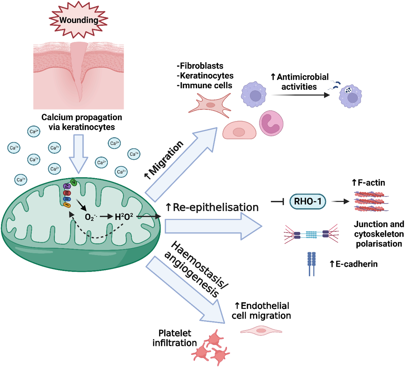 During re-epithelialisation of skin during wound repair, several proteins act to aid in keratinocyte migration and proliferating, as well as the formation and regulation of the cytoskeleton. These include F-actin, myosin, and E-cadherin (Rousselle et al., 2019). Importantly, studies have shown that mtROS promotes wound healing by regulating F-actin and myosin at the wound edge (Xu and Chisholm, 2011; Muliyil and Narasimha, 2014; Xu and Chisholm, 2014; Hunter et al., 2018; Fung et al., 2023). Of note, in the later Xu and Chisholm study they demonstrated that wounding in C. elegans induced a rapid release of Ca2+ around the wound site and uptake into mitochondria, subsequently inducing mtROS production. This mtROS then inhibits RHO-1 activity via oxidation of cysteine residues (Lambeth and Neish, 2014) to enhance F-actin build up and accelerate wound closure (Xu and Chisholm, 2014). The more recent study by Hunter et al. confirmed the key role of mtROS in the promotion of E-cadherin trafficking as well as junction and cytoskeleton polarisation in wound closure. Again, it was shown that Ca2+ signals released immediately after wounding induced a greater production of mtROS, leading to cytoskeleton remodelling mediated by redox signalling (Hunter et al., 2018).