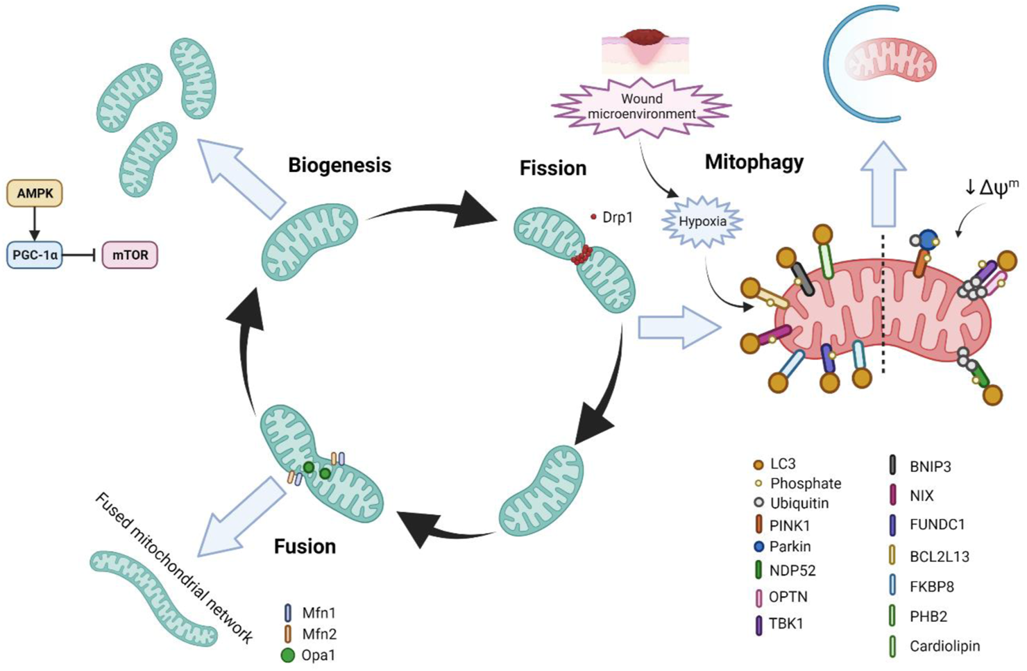 The life cycle of mitochondria and mitochondrial homeostasis and wound healing. In response to increased energetic demand in the cell, mitochondria can fuse with other mitochondria as well as increase their number through mitochondrial biogenesis (mitogenesis). In contrast, when the energy requirements in the cell are diminished or the cell is stressed, mitochondria can undergo fission/fragmentation in order to reprogramme the cellular metabolic state. Further, mitochondria can undergo degradation through mitophagy in order to clear damaged mitochondria and to prevent cellular stress.