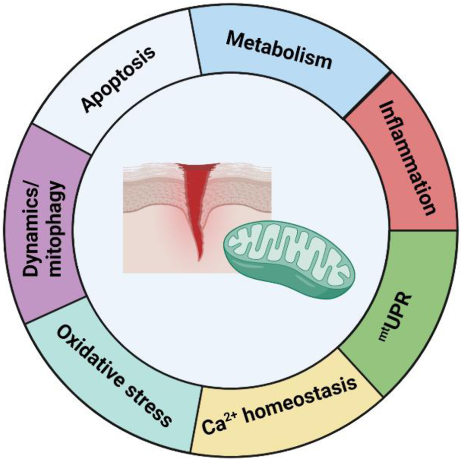 Mitochondria are well known as being the cellular hubs for the generation and storage of energy in the form of adenosine triphosphate (ATP) (Spinelli and Haigis, 2018), however they are also responsible for several other key cellular processes including stress response, immunity, redox state, calcium (Ca2+) homeostasis, and cell fate (Shen et al., 2022). In all cases, communication between mitochondria and the nucleus is essential, in what is known as mito-nuclear crosstalk or retrograde signalling (Cardamone et al., 2018; Kim et al., 2018). In this important feedback mechanism, the mitochondria sense stress signals and relay them to the nucleus, whereby the nucleus responds by activating one or more stress response pathways (Picard and Shirihai, 2022). This can lead to alterations in mitochondrial structure and function, allowing mitochondria to adapt to what is required in order to maintain mitochondrial homeostasis. One important aspect of this is changes to mitochondrial shape (mitochondrial dynamics) and number (mitochondrial biogenesis and mitophagy) (Ma et al., 2020). In the context of wound healing, all these cellular processes are important for normal functioning, as is highlighted by a range of literature in the field and reports of mitochondrial involvement in various skin pathologies with wound healing-related characteristics (Table 1). However, in this review, we will focus on what is known about the role of mitochondria in the regulation of metabolism in wound healing, redox signalling, mitochondrial control of apoptosis, and the underlying regulation of mitochondrial homeostasis through mitochondrial dynamics and mitophagy.