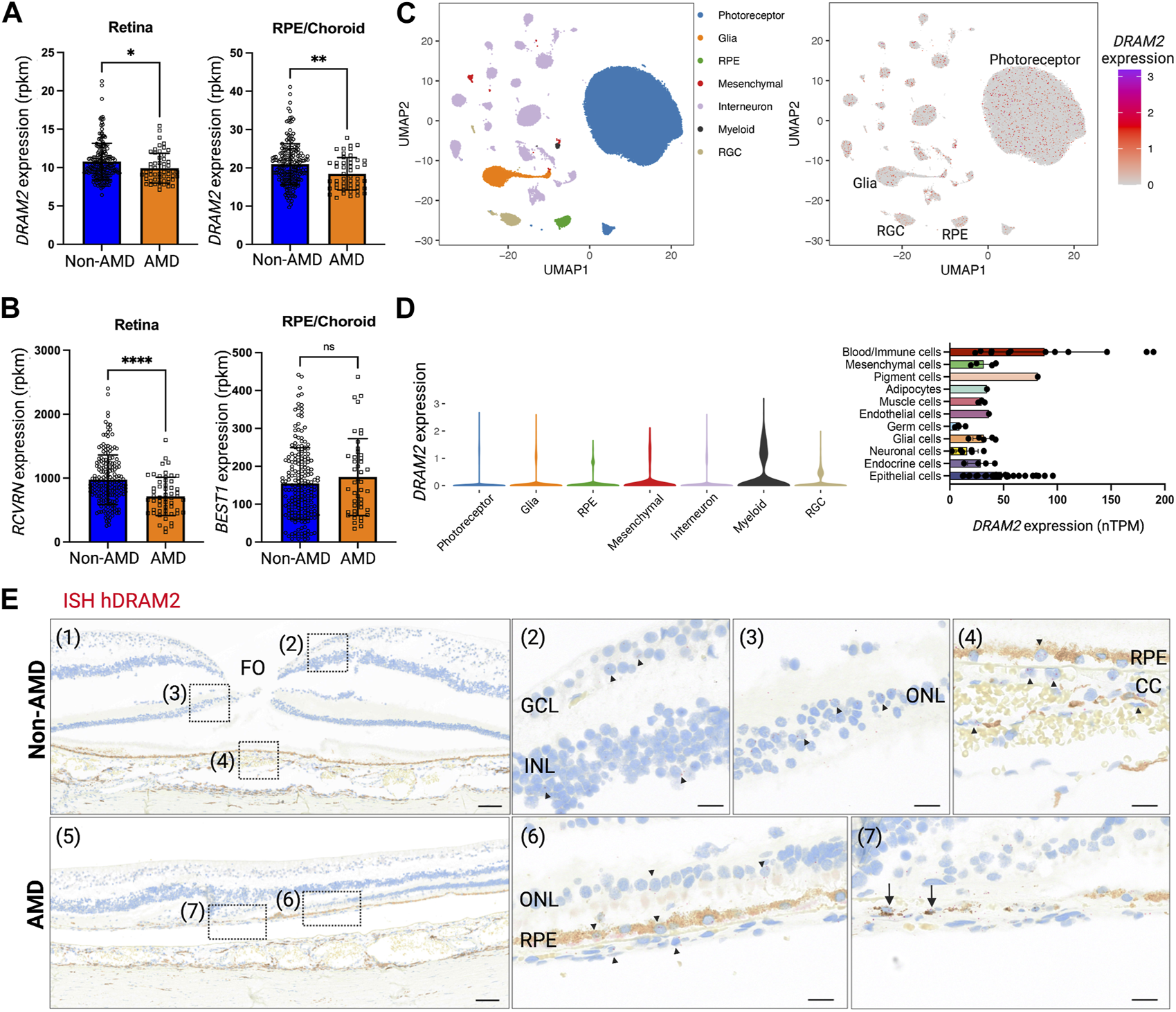 Human DRAM2 is ubiquitously expressed in the eye. (A)DRAM2 expression (rpkm) in human non-Age-related Macular Degeneration (AMD) or AMD retina and retinal pigment epithelium (RPE)/choroid samples (n = 49 to 198, Unpaired t-test, *p < 0.05, **p < 0.01). (B) Expression of key markers for photoreceptors (RCVRN) and RPE cells (BEST1) in human non-AMD or AMD retina and RPE/choroid samples (n = 49 to 198, unpaired t-test, ****p < 0.0001, ns: not significant p > 0.05). (C)DRAM2 expression in single nuclei RNA sequencing of human non-AMD eyes (n = 4); data from (Orozco et al., 2020). (D)DRAM2 expression in different cell types (left panel, snRNA seq from non-AMD eyes (n = 4); data from (Orozco et al., 2020)) and other organs (right panel, scRNA seq data compiled from the Human Protein Atlas (Karlsson et al., 2021)). (E)In situ hybridization (ISH) of DRAM2 mRNA in human non-AMD (top panels) and AMD (bottom panels) donor eyes. Representative images from n = 4 non-AMD eyes and 8 AMD eyes. Nuclear stain is in blue, natural pigment in the RPE is in brown and the ISH signal in red. (1) Area of fovea (FO). (2) DRAM2 signal is sparsely disseminated in the ganglion cell layer (GCL) as well as inner nuclear layer (INL). (3) DRAM2 signal is also sparsely disseminated in the outer nuclear layer (ONL), i.e., associated with photoreceptors nuclei. (4) Sparse DRAM2 signal localizes to cells of the choriocapillaris (CC) and retinal pigment epithelium (RPE). (5) Lesion edge in an AMD donor eye. (6) Adjacent to the lesion, sparse DRAM2 signal is disseminated in the stretch of contiguous RPE and the few residual photoreceptors in the ONL. (7) Within the lesion, a relatively abundant DRAM2 signal is associated with cells in the area of the destroyed RPE (black arrows). (FO, fovea; GCL, ganglion cell layer; INL, inner nuclear layer; ONL, outer nuclear layer; RPE, retinal pigment epithelium; CC, choriocapillaris). Scale bar: 100 µm on panels (1) and (5), and 20 µm on panels (2), (3), (4), (6) and (7).