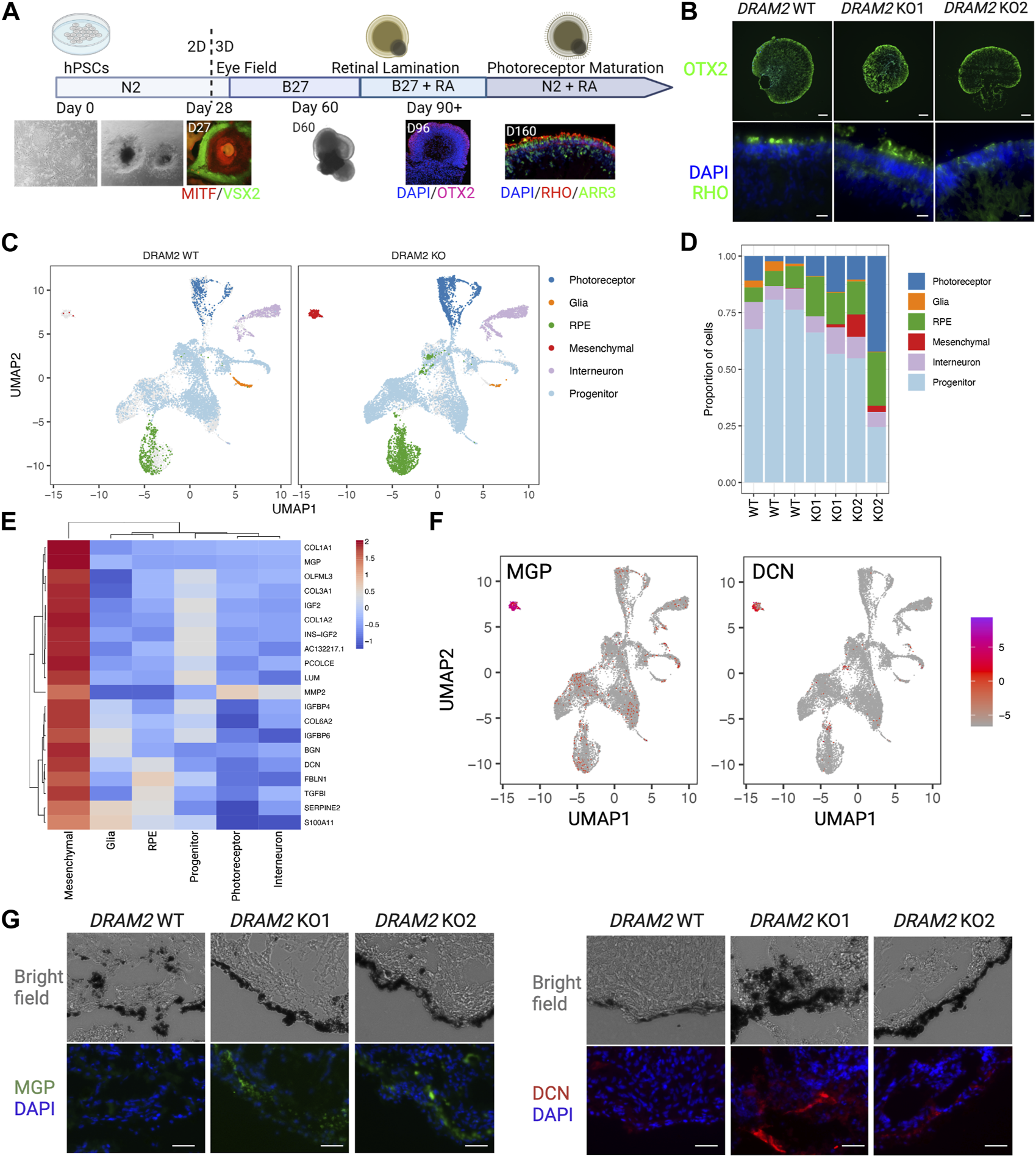Absence of transcriptional changes in hPSC-retinal organoids knockout for DRAM2 but presence of an extra cell cluster with mesenchymal signature (A) Overview of the differentiation protocol of human pluripotent stem cells (hPSC)-derived retinal organoids. MITF: RPE progenitor marker; VSX2, neuronal progenitor marker; OTX2, retinal progenitor marker; RHO, rod photoreceptor marker; ARR3, cone photoreceptor marker. (B) Representative immunofluorescent images of DRAM2 WT, KO1, and KO2 hPSC-derived retinal organoids. Scale bars in upper panels: 100 µm. At day 160, retinal organoids express retinal progenitor (OTX2) and photoreceptor markers (RHO). Scale bars in bottom panels: 20 µm. (C) UMAP representation of single cell RNA sequencing (scRNAseq) of DRAM2 WT and KO hPSC-derived retinal organoids identifying 6 clusters of different cell types. (D) Proportion of the different cell types from identified cell clusters from the scRNAseq of DRAM2 WT and KO retinal organoids. (E) Heatmap showing expression of the mesenchymal markers by cell type (pseudobulk, genotypes pooled). (F) UMAP representation of Matrix Gla Protein (MGP) and decorin (DCN) expression in the scRNAseq of retinal organoids, showing predominant expression in the mesenchymal cluster. (G) Representative images of immunolabeling of MGP (left) and DCN (right) in DRAM2 WT, KO1, and KO2 hPSC-derived retinal organoids. Scale bars: 25 µm.