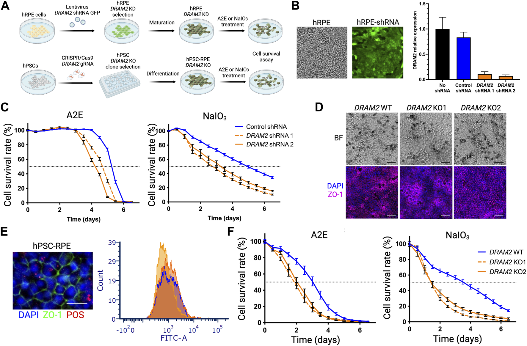 Dram2 loss exacerbates toxicity-induced human RPE cell death in vitro(A) Experimental design of loss of DRAM2 experiments in human cells. hRPE, human primary retinal pigment epithelial (RPE) cells; KD, knockdown; A2E, N-retinylidene-N-retinylethanolamine; NaOI3, Sodium Iodate; hPSC, human pluripotent stem cells; KO, Knockout. (B) Representative image of hRPE after infection with lentivirus expressing DRAM2 shRNA and GFP (left) and knockdown efficiency of the two different DRAM2 shRNAs assessed by quantitative RT-PCR (qPCR) analysis of DRAM2 expression (right) (C) hRPE cell survival following treatment with A2E (30 μM; left) and NaIO3 (5 mM; right). Dotted horizontal line marks the median survival (50% of the cells alive). (D) Differentiation of DRAM2 WT and KO human pluripotent stem cells (hPSCs) into RPE (hPSC-RPE) showing pigmentation (top row, BF: Bright Field) and expression of RPE maker ZO-1 (bottom row). Scale bars: 50 µm. (E) Representative immunofluorescent image (left) of RPE marker ZO-1 (green) in hPSC-RPE DRAM2 WT, KO1, and KO2 and phagocytosis of FITC-labeled Photoreceptor Outer Segments (POS; red). Scale bar: 20 µm. Phagocytosis capacity of the cells was assessed by quantification of cells with internalized FITC-POS by flow cytometry (DRAM2 WT: blue line, DRAM2 KO1 and 2: orange lines). (F) hPSC-RPE cell survival following treatment with A2E (30 μM; left) and NaIO3 (5 mM; right). Dotted horizontal line marks the median survival.