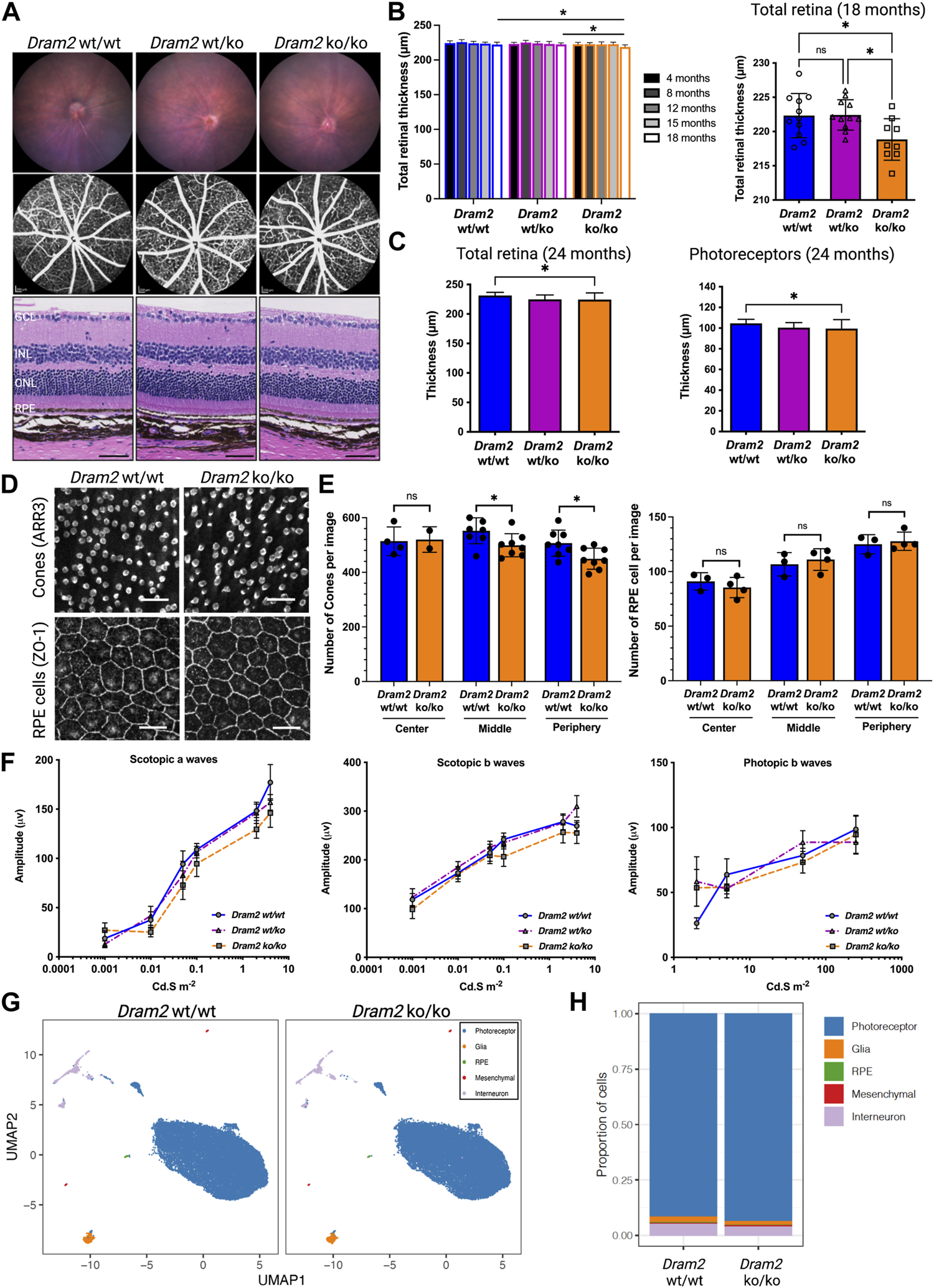 Dram2 loss causes very mild age-related photoreceptor degeneration with absence of functional deficit or transcriptional changes in mice. (A) Fundus imaging (top row) and fundus angiography (middle row) at 4-month of age. Histopathological (bottom row) analyses of Dram2 wt/wt, wt/ko, and ko/ko mice at 24 months (Hematoxylin Eosin, 200 µm from the optic nerve head). GCL, ganglion cell layer; INL, inner nuclear layer; ONL, outer nuclear layer; RPE, retinal pigment epithelium. Scale bar, 50 µm. (B) Optical coherence tomography (OCT) analysis followed by automated segmentation of retinal thickness in Dram2 wt/wt, wt/ko, and ko/ko. Time course of retinal thickness of all genotypes from 4 to 18-month of age (left; n = 8–14 mice per genotype; one-way ANOVA *p < 0.05) and between the genotypes at 18-month of age (right; n = 9–11 mice per genotype; one-way ANOVA *p < 0.05; ns, not significant). (C) Total retinal thickness at 24 months (left) and photoreceptor layer thickness (right) of Dram2 wt/wt, wt/ko, and ko/ko mice (n = 16–27 mice per genotype, one-way ANOVA *p < 0.05). Automated 8-layer retinal segmentation was performed on this cohort of mice and only the photoreceptor layer (Outer nuclear layer (ONL) + inner segment + outer segment) showed significant difference between Dram2 wt/wt and Dram2 ko/ko mice (other layers shown in Supplementary Figure S3A). (D) Representative immunofluorescent image of cone photoreceptor cells (ARR3; top row) and RPE cells (ZO-1; bottom row) from peripheral retina. Scale bar, 25 µm. (E) Quantification of cone photoreceptor cells (left) and RPE cells (right) in Dram2 wt/wt and Dram2 ko/ko retinas (Mann-Whitney test, *p < 0.05, ns, not significant). (F) Electroretinography (ERG) analysis of Dram2 wt/wt, wt/ko, and ko/ko mice at 21 months. (mean±SEM, n = 9–10 mice per genotype). (G) UMAP representations of single cell RNA sequencing (scRNAseq) analysis of Dram2 wt/wt and ko/ko retinas (H) Proportion of cell types per genotype identified from the scRNAseq analysis.