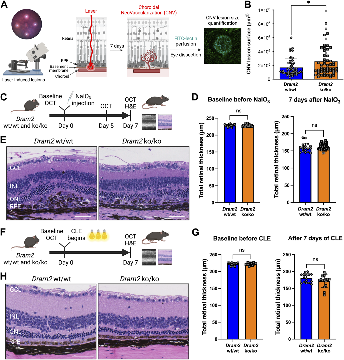 Dram2 loss exacerbates choroidal neovascularization lesions but does not exacerbate retinal dystrophy in mouse pre-clinical models involving photoreceptor or RPE injury (A) Experimental design of the laser-induced choroidal neovascularization (CNV) mouse pre-clinical model. (B) Quantification of CNV lesion surface size (in µm2) 7 days after disruption of the basement membrane by the laser burn in Dram2 wt/wt and ko/ko retinas (n = 55 lesions per genotype, unpaired t-test, *: p < 0.05). (C) Experimental design of the sodium iodate (NaIO3) degeneration model (three independent cohorts, n = 9 to 15 mice per genotype at 5–18 weeks of age). OCT, optical coherence tomography; H&E, hematoxylin and eosin. (D) Retinal thickness in the NaIO3 experiment measured by OCT in Dram2 wt/wt and ko/ko mice at baseline (left) and 7 days (right) after NaIO3 treatment. Unpaired t-test; ns, not significant. (E) Histopathological analysis of Dram2 wt/wt (left) and ko/ko (right) retinas after NaIO3 treatment. (F) Experimental design of the constant light exposure (CLE) degeneration model (three independent cohorts, n = 8 mice per genotype at 33–40 weeks of age). (G) Retinal thickness in the CLE experiment measured by OCT in Dram2 wt/wt and ko/ko mice at baseline (day 0, left) and after 7 days of exposure (right). Unpaired t-test; ns, not significant. (H) Histopathological analysis of Dram2 wt/wt and ko/ko retinas after CLE (day 7). Scale bars = 50 µm. GCL, ganglion cell layer; INL, inner nuclear layer; ONL, outer nuclear layer; RPE, retinal pigment epithelium.