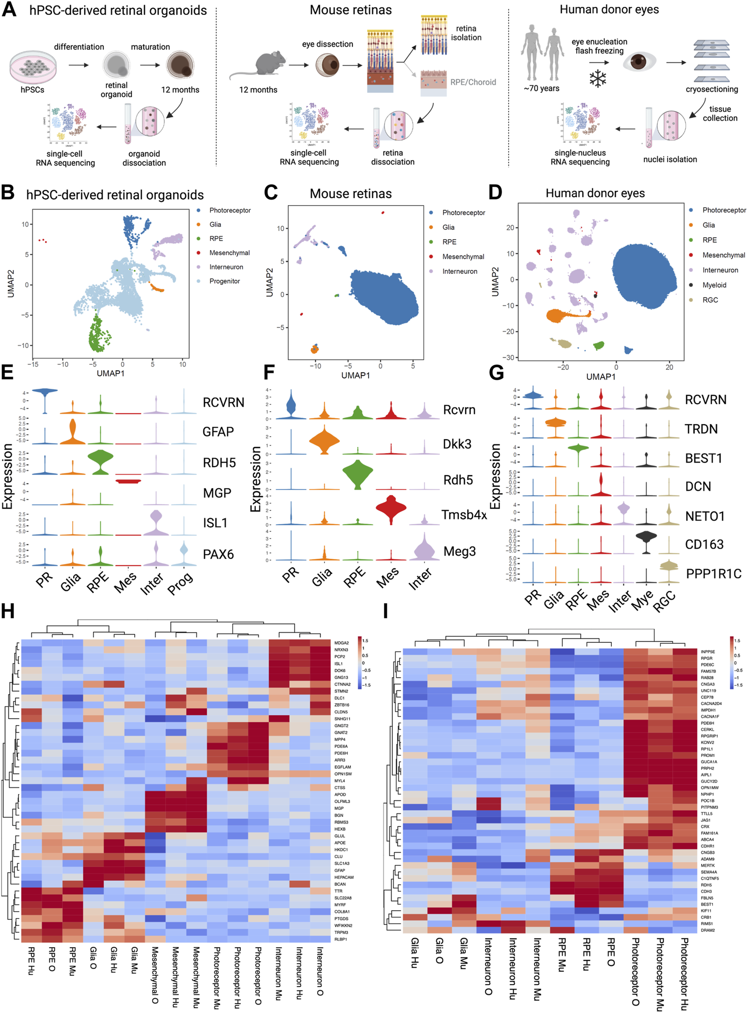 Comparative analysis of single cell analysis of human stem cell-derived retinal organoids, mouse retina and human retina (A) Diagrams of the experimental designs to generate single cell RNA sequencing (scRNA seq) data from human Pluripotent Stem Cells (hPSCs)-derived retinal organoids (left), scRNA seq data from mouse retinas (middle) and single nucleus RNA sequencing (snRNA seq) data from human eyes (right). (B) UMAP representation of the hPSC- retinal organoid scRNAseq analysis. (C) UMAP representation of the mouse retinal scRNAseq analysis. (D) UMAP representation of the human eyes snRNAseq analysis. (E) Violin plot of key marker genes expression for identified cell types in hPSC- retinal organoids. PR, photoreceptor; RPE, retinal pigment epithelium; Mes, mesenchymal; Inter, interneurons; Prog, progenitors. (F) Violin plot of key marker genes expression for identified cell types in mouse retinas. PR, photoreceptor; RPE, retinal pigment epithelium; Mes, mesenchymal; Inter, interneurons. (G) Violin plot of key marker genes expression for identified cell types in human eyes. PR, photoreceptor; RPE, retinal pigment epithelium; Mes, mesenchymal; Inter, interneurons; Mye, myeloid cells; RGC, retinal ganglion cells. (H) Heatmap of the unsupervised hierarchical cluster analysis of top marker genes per cell types identified in all three datasets. Mu, mouse retina scRNAseq; O, hPSC- retinal organoid scRNAseq; Hu, human snRNAseq. (I) Heatmap of the hierarchical cluster analysis of known cone-rod macular dystrophy genes expressed in the three datasets. Mu, mouse retina scRNAseq; O, hPSC-retinal organoid scRNAseq; Hu, human snRNAseq.