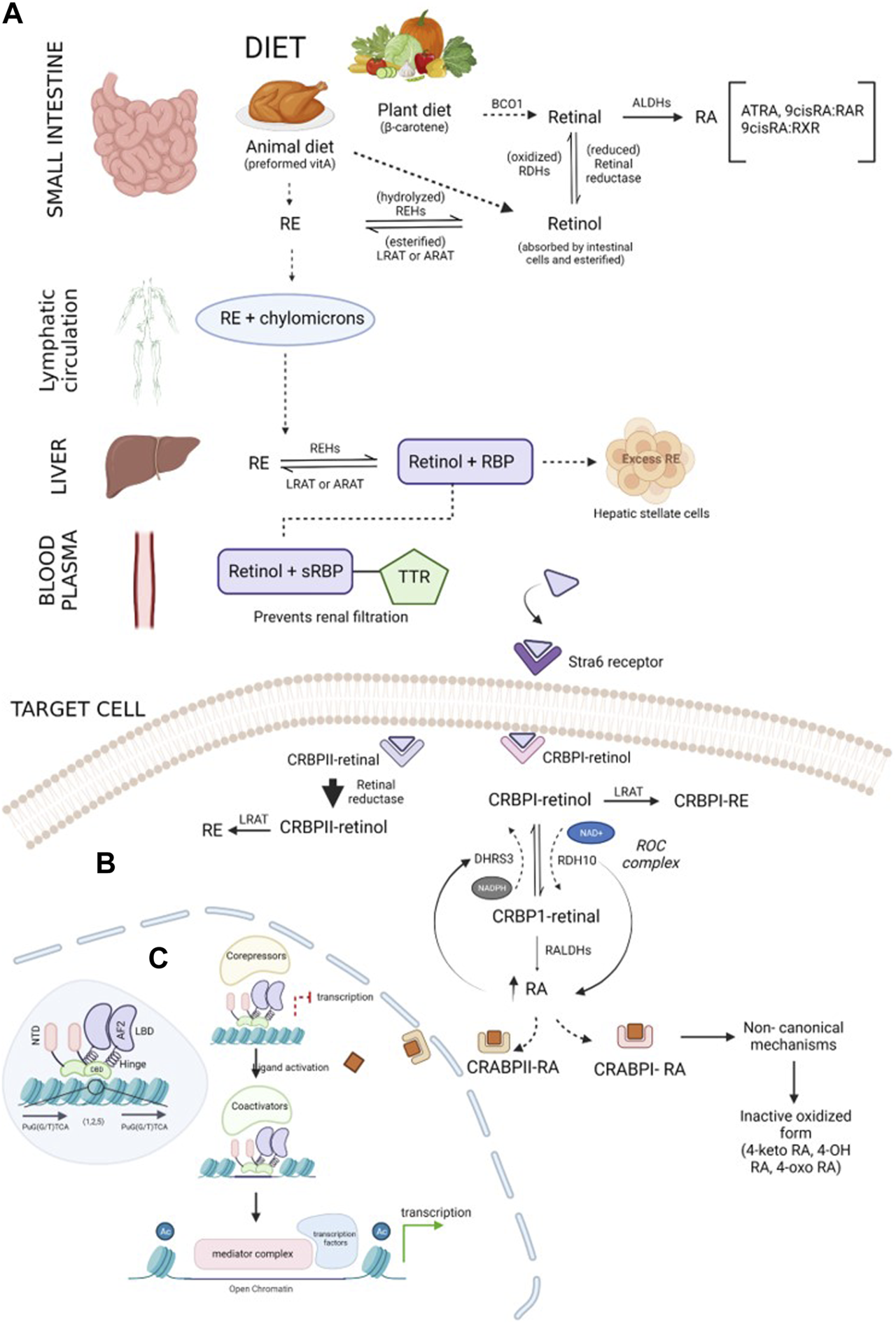 Schematic representation of the retinoid synthesis pathway: (A) vitamin A is converted to its active forms (RE and retinol) in the small intestine. β-Carotene obtained through plant diet is acted upon by the BCO1 enzyme, forming retinal molecules. Retinal can either be reduced to retinol by retinal reductase or oxidized by ALDHs, forming RA. Preformed vitamin A, retinol, and RE obtained through animal diet can be interconverted by enzymes REHs, LRAT, or ARAT. Chylomicrons transport RE through the lymphatic system and transfer it to the liver. The required RE is converted into retinol, and excess RE is stored in hepatic stellate cells. Lipophilic retinol binds to the retinol-binding protein to traverse in an aqueous medium. In blood plasma, the retinol–RBP complex tethers to TTR, preventing renal purification by increasing the compound weight. Upon reaching the target cell, TTR shreds from the complex, and sRBP delivers retinol to the Stra6 receptor present in the plasma membrane of the cell. (B) Regulation of retinoids inside the target cell: retinol is received by binding proteins (CRBPI and II) present in the cytosol. CRBPI-binding proteins facilitate the intake of retinol by the conversion of retinol to RE or RA. Based on the RA requirement of the cell, CRBPI-bound retinol is oxidized to CRBPI-bound retinal by RDHs and ROC, which are, in turn, oxidized by RALDHs, forming RA. A negative feedback loop regulates RA levels in the cells through the ROC complex. The ROC heterooligomeric compound consists of DHRS3 (reductive action using the NADPH cofactor) and RDH10 (oxidative action using the NAD+ cofactor). An increase in RA upregulates DHRS3 control and downregulates RDH10 activity, and a decrease in RA follows vice versa conversion. RA bound to CRABPI undergoes non-canonical mechanisms, followed by conversion to its inactive oxidized form and elimination, while RA bound to CRABPII is transported to RA receptors in the nucleus to activate transcription of target genes. Excess RA formation is toxic and is prevented by the CRABPII protein. The retinal bound to CRABPII has a higher reduction rate than its oxidative tendency. (C) Overview of the transcription mechanism of target genes by the RA receptor: RA receptors are present in the heterodimerized form bound to target response elements composed of direct repeats of PuG(G/T)TCA (shown in the blue-shaded region inside the nucleus). The receptor is composed of five main domains (NTD, DBD, hinge, LBD, and F-region). The unliganded receptor recruits corepressors which repress the transcription of the genes. CRABPII delivers the ligand to the receptor. CRABPII is sent back to the cytosol, followed by the short interaction of the binding protein with the RA receptor. Upon ligand activation by RA, the corepressors disassociate, promoting chromatin decompaction by coactivators. In the third step, the coactivators disassemble, followed by assembling of the mediator complex, which further recruits transcription machinery, initiating the expression of target genes.