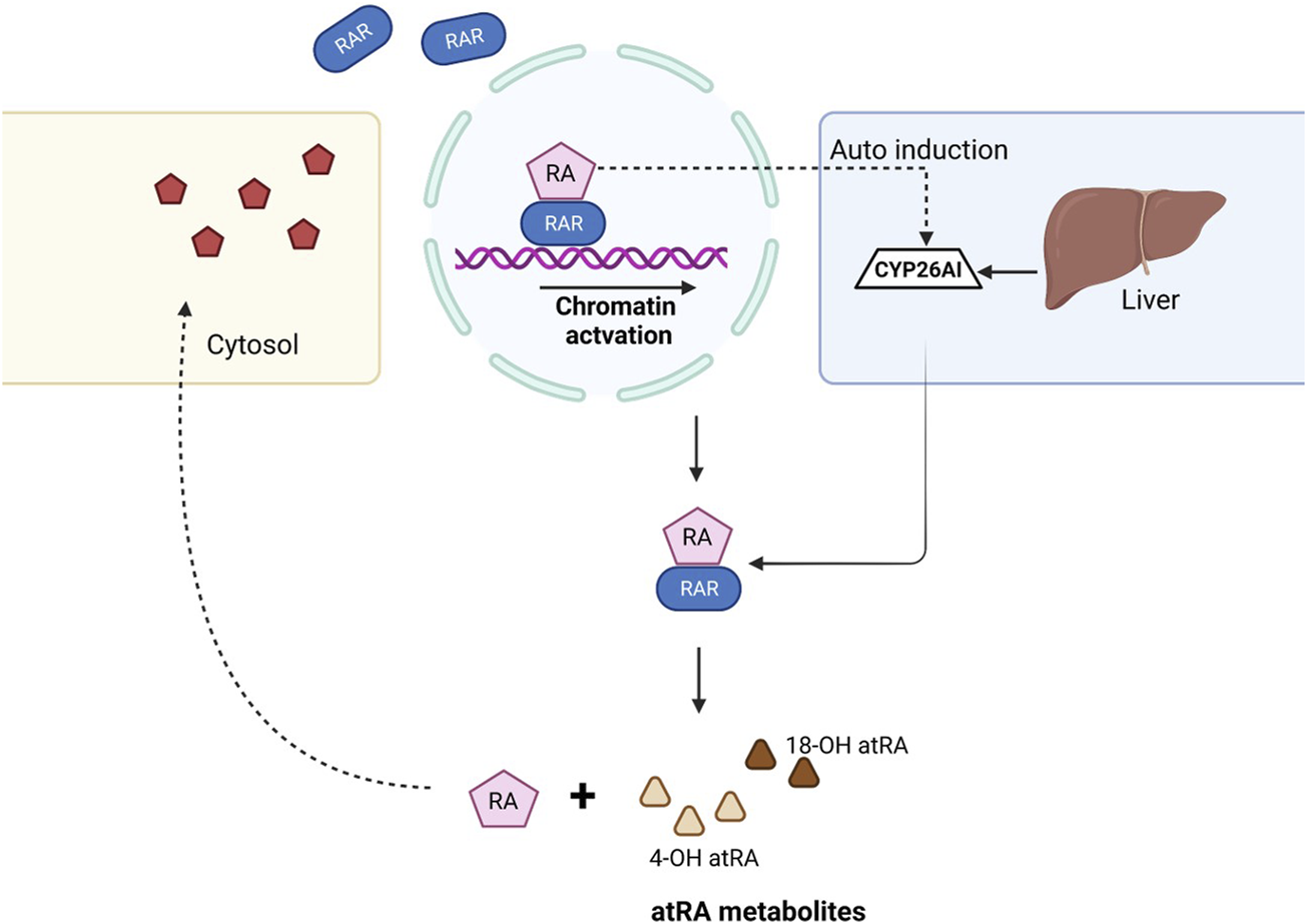 Mechanism of ATRA clearance in the cell. When the RA ligand binds to the RAR, gene transcription takes place and results in downstream activation. Once the RA role is fulfilled, CYP26 family enzymes auto-induce from the liver and help in the clearance of ATRA, thus balancing the levels of RA within the cell. ATRA, with the help of CYP26A1 and CYP26B1, dissociates to form 4-OH atRA and 18-OH atRA.