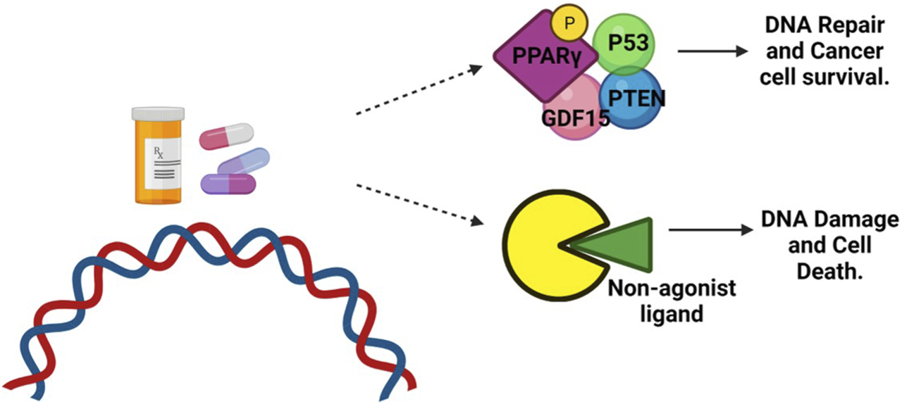 Role of PPARγ in cancer treatment. DNA-damaging agents, such as chemotherapy, can induce phosphorylation of PPARγ. This phosphorylated form of PPARγ then interacts with the tumor suppressor protein P53, antiproliferative phosphatase PTEN, and cell cycle-arresting protein GDF-15. This interaction promotes DNA repair and enhances the survival of cancer cells. However, when treated with a non-agonist PPARγ ligand, the phosphorylation of PPARγ is blocked. As a result, the interaction between PPARγ and P53 is disrupted. This disruption prevents the repair of DNA damage, leading to the accumulation of unrepaired DNA and triggering apoptotic cell death.