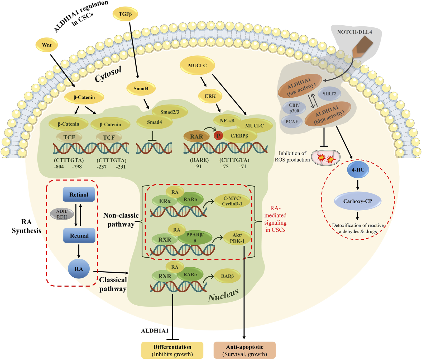 Overview of RA-mediated gene regulation in both classical and non-classical pathways, along with ALDH1A1 regulation in CSCs. The genomic and non-genomic pathways by ATRA were explained previously, which either results in cell differentiation or cellular proliferation.