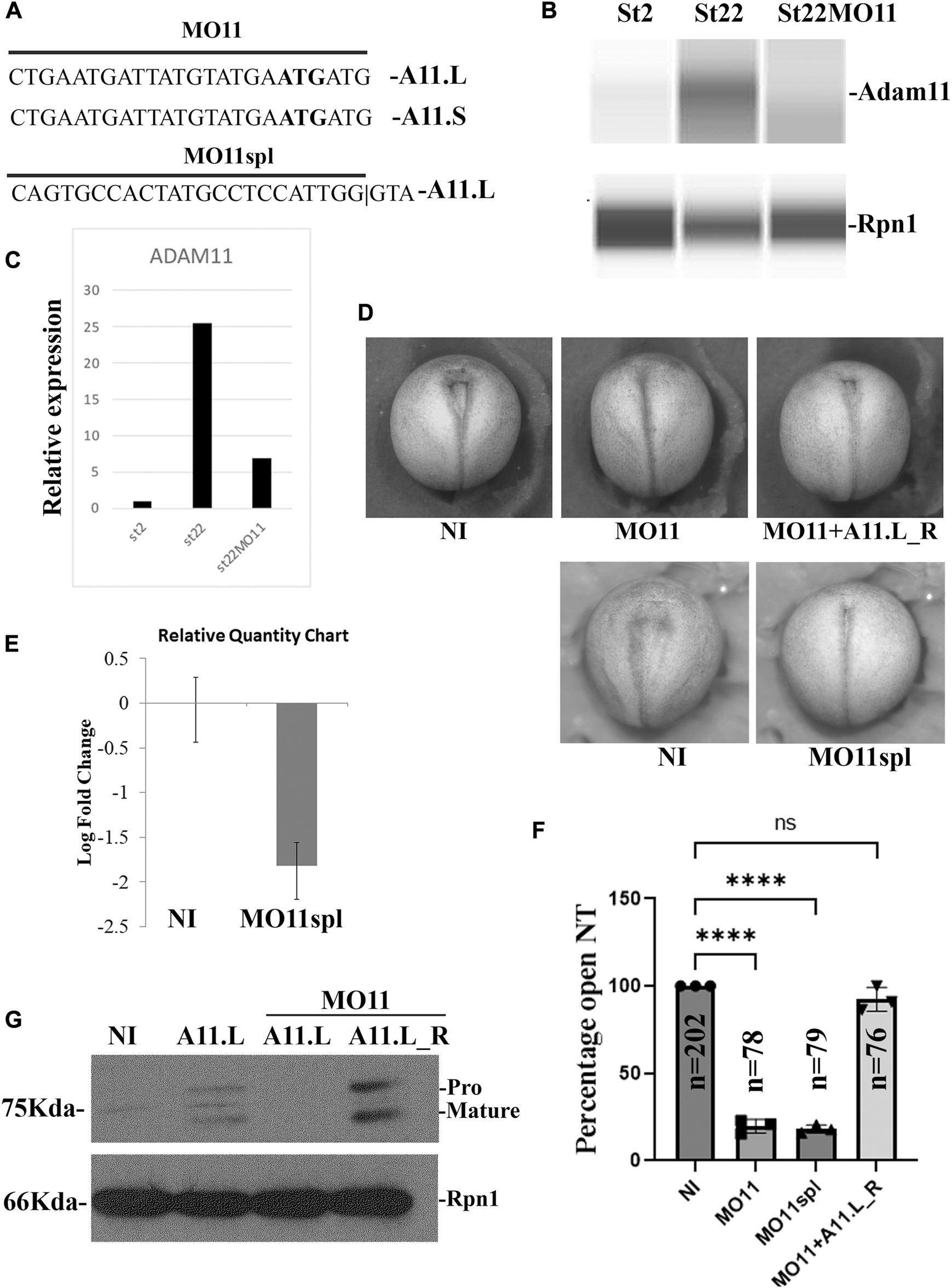 Adam11 Knock Down. (A) Morpholino design. Coding sequences for Adam11.L and S with the translation start (ATG) bolded matching the translation-blocking morpholino (MO11). (B) Capillary Western blot with a monoclonal antibody (mAb) to Adam11 (DA3C5) using membrane extract from 10 embryos at stage 2 and 22. Knockdown efficiency of a translation-blocking MO for Adam11 (MO11) was tested on either non-injected control embryos or embryos injected at the one-cell stage with 12.5 ng of MO11. (C) Quantitative representation of the capillary western bot from (B) using ribophorin 1 (Rpn1) to normalize. (D) Representative photograph of neurula stage embryos (Dorsal view). Anterior is up. Embryos were injected at the one-cell stage with either the translational blocking MO11 or Splicing blocking MO11spl. Embryos injected with MO11 were rescued using 12.5 pg of ADAM11_R rescue mRNA, lacking the morpholino binding sequence. (E) The histogram represents RT-qPCR from embryos injected with Adam11.L splice-blocking morpholino. The oligonucleotides are designed to only amplify the spliced mRNA. (F) Histogram representing statistical analysis of the phenotype represented in (D). Each dot represents one biological replicate, the total number of embryos analyzed for each condition is given (n). (G) Western blot of Adam11.L-flag. Adam11.L mRNA (1 ng) was injected at the one-cell stage either alone or with MO11 (12.5 ng). Adam11.L_R rescue lacking the 5′untranslated sequence is translated even in the presence of MO11. Asterisks represent the statistical significance (ANOVA) at p < 0.0001 (****).