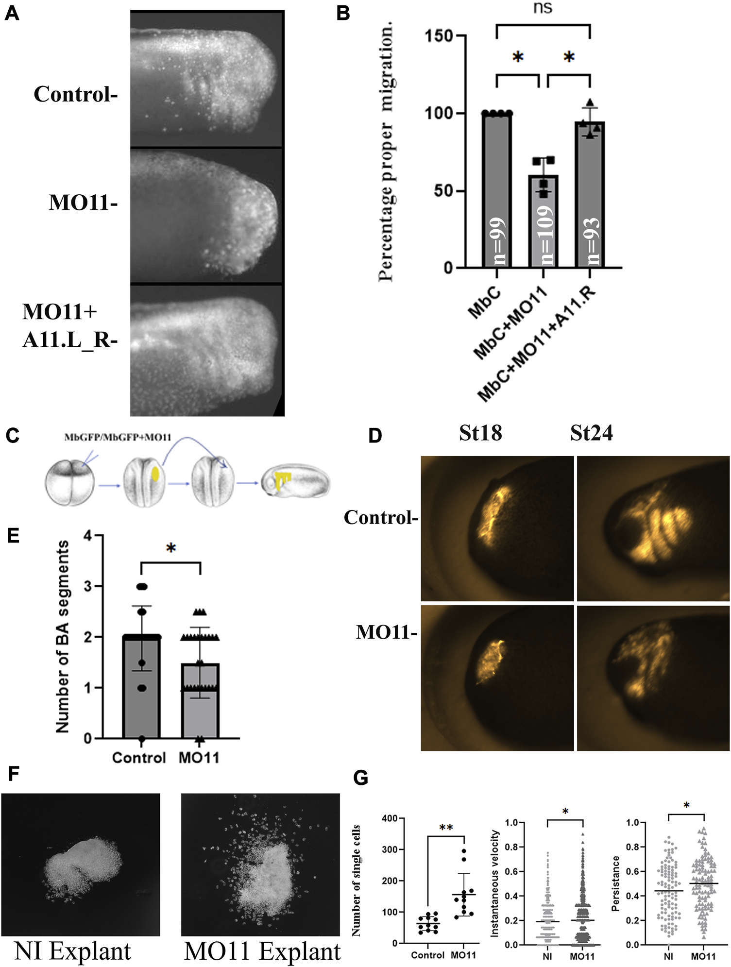 Adam11 Knock down affects cranial neural crest cell migration. (A) Fluorescent tracking of CNC migration. Lineage tracer (MbC; Membrane Cherry) was injected at the 8-cell-stage in one dorsal animal blastomere, either alone (control) or with the morpholino to Adam11 (1.56 ng) or both MO11 and the Adam11L_R rescue mRNA (125 pg). The presence or absence of fluorescent neural crest on the lateral and ventral side of the embryo is scored only in embryos with proper targeting (Dorsal anterior quadrant). (B) Statistical analysis of the targeted injection. The percentage of embryos with fluorescent CNC in the migration pathway is represented (Y-axis) normalized to embryos injected with Membrane Cherry alone (100%). Individual dots, squares and triangles represent each biological replicates (4). Asterisks represent the p-value for ANOVA< 0.05. (C) Schematic diagram of CNC grafting experiment. (D). Representative photographs of embryo grafted with fluorescent CNC explant at stage 18 and scored at stage 24 for both control and MO11 injected embryos. (E) Statistical analysis of the grafting experiment (n is the number of grafted embryos). The histogram represents the number of branchial arches (BA) segments scored at stage 24. Each dot or triangle represents one embryo from five biological replicates (** = p < 0.01). (F) Representative example of Cranial neural crest cell explants on fibronectin. Photographs were taken during the initial phase of collective cell migration (5 h). (G) Statistical analysis of cellular migration showing the number of single cells per explant, the instantaneous velocity and the persistence of cell migration. Single cells were scored at 5 h. Each dot represents one explant. The instantaneous velocity was measured for 110 single cells over (30 min). The persistence of migration was measured on the same cells by dividing the distance from the start and end position by the distance traveled. At least 3 biological replicates for each experiment. Student’s t-test was applied (**=p < 0.01, *=p < 0.05).