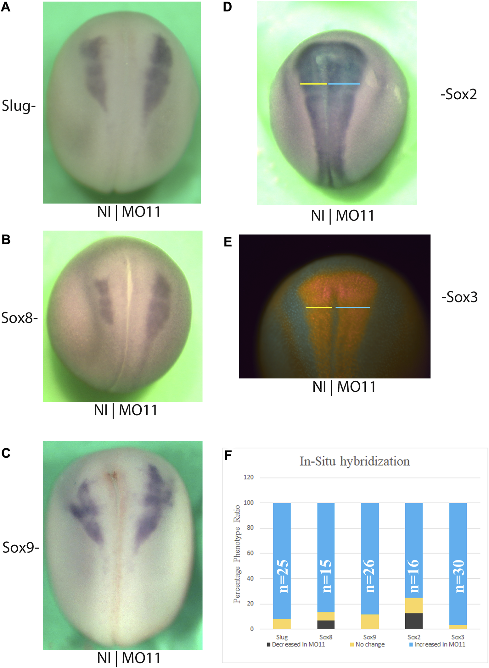 Given the distribution of Adam11.L mRNA in the CNC and neural tube, and the phenotypes observed following Adam11 KD, we focused our analysis on neural and neural crest markers at stages when the first phenotype is visible (Neurula stage). We used the well-characterized neural crest marker Slug/Snai2 (Figure 3A), Sox8 (Figure 3B), and Sox9 (Figure 3C) in embryos injected unilaterally at the 2-cell stage with MO11 and a fluorescent lineage tracer. This allows KD in one-half of the embryo (right or left side). In-situ hybridization revealed that all three markers were expressed at the appropriate position. Interestingly, we found that these markers were increased on the injected side (Right and Figure 3F). Expansion of the neural crest territory can, in some cases, be done at the expense of the neural ectoderm. We tested the position of two neural markers, Sox2 (Figure 3D) by in situ hybridization and Sox3 by immunostaining (Figure 3E). In both cases, we found that the domain of expression on the injected side was also wider, suggesting that the increase in neural crest territory was not done at the expense of the neural tissue.