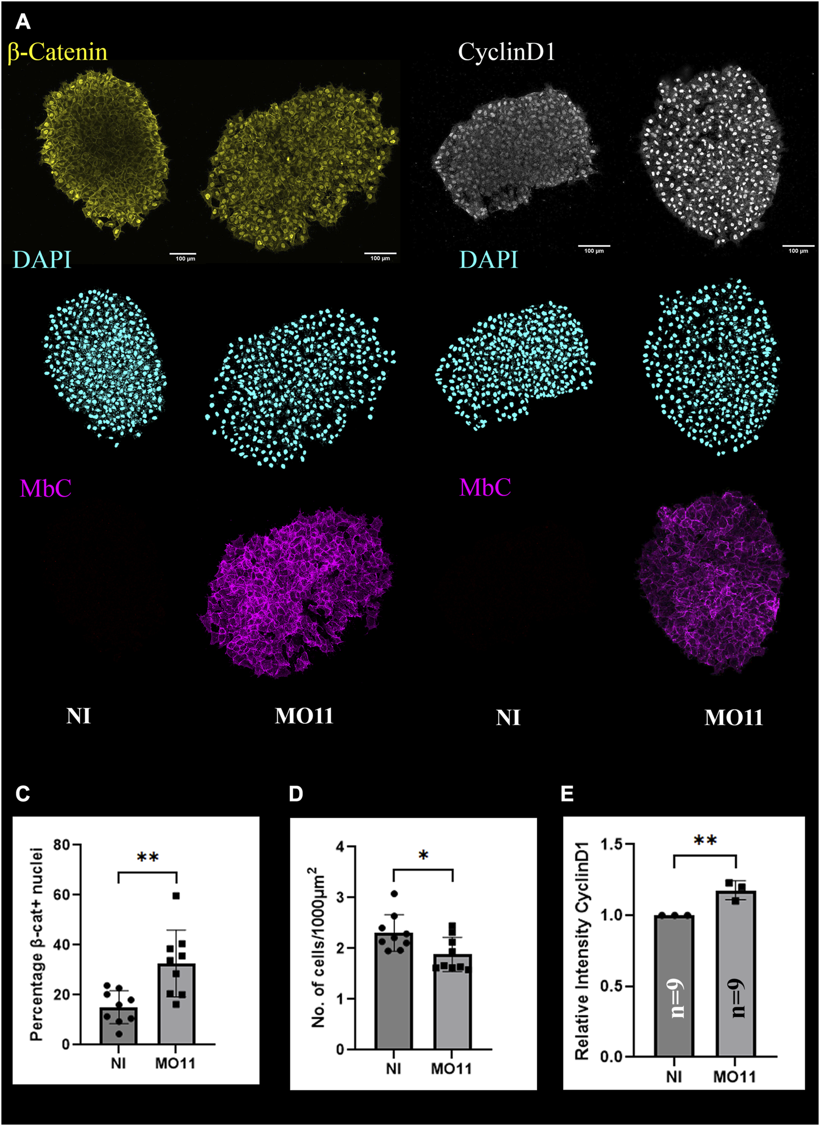 Given the early onset of single CNC cell migration and increased Slug expression, we hypothesized that β-catenin controlled EMT could be dysregulated following Adam11 KD. To test this hypothesis, we dissected CNC explants from embryos injected into one cell of the two-cell stage and compared the explants from the control and the injected side after migration on fibronectin-coated slides (Figure 4). Membrane Cherry was co-injected with the morpholino to identify the injected side and confirm that the CNC had been targeted. We found that while the overall fluorescence of β-catenin was similar on the control and injected side, the percentage of nuclei with β-catenin protein was expanded on the injected side (Figures 4A, C compare NI to MO11). In control explants, the β-catenin protein was present near the plasma membrane and in the nuclei of the cells that are at the leading edge of the explant but was mostly restricted to the plasma membrane in cells within the explant (Figure 4A, NI) (Alfandari et al., 2010). In contrast, explants missing Adam11 show nuclear β-catenin localization all the way through the explant (Figure 4A MO11). In addition, it is also clear that the nuclei of the control explants are more packed (Figure 4A DAPI) than the one from the Adam11 KD, suggesting that the cells are denser on the FN substrate (Figure 4D). Nuclear β-catenin is known to activate gene expression, including slug (Figure 3A) and cyclin D1. We, therefore, tested the expression of CyclinD1 in CNC explants (Figure 4B). Again, while the expression of CyclinD1 is mostly restricted to the periphery of the CNC explant from the control side, the expression is present throughout the explant from the injected side, and the overall intensity is significantly higher than in the control side (Figure 4E). It is important to note that these images are maximum projections so that protein expression levels should not be affected by their relative Z-position within the explant.