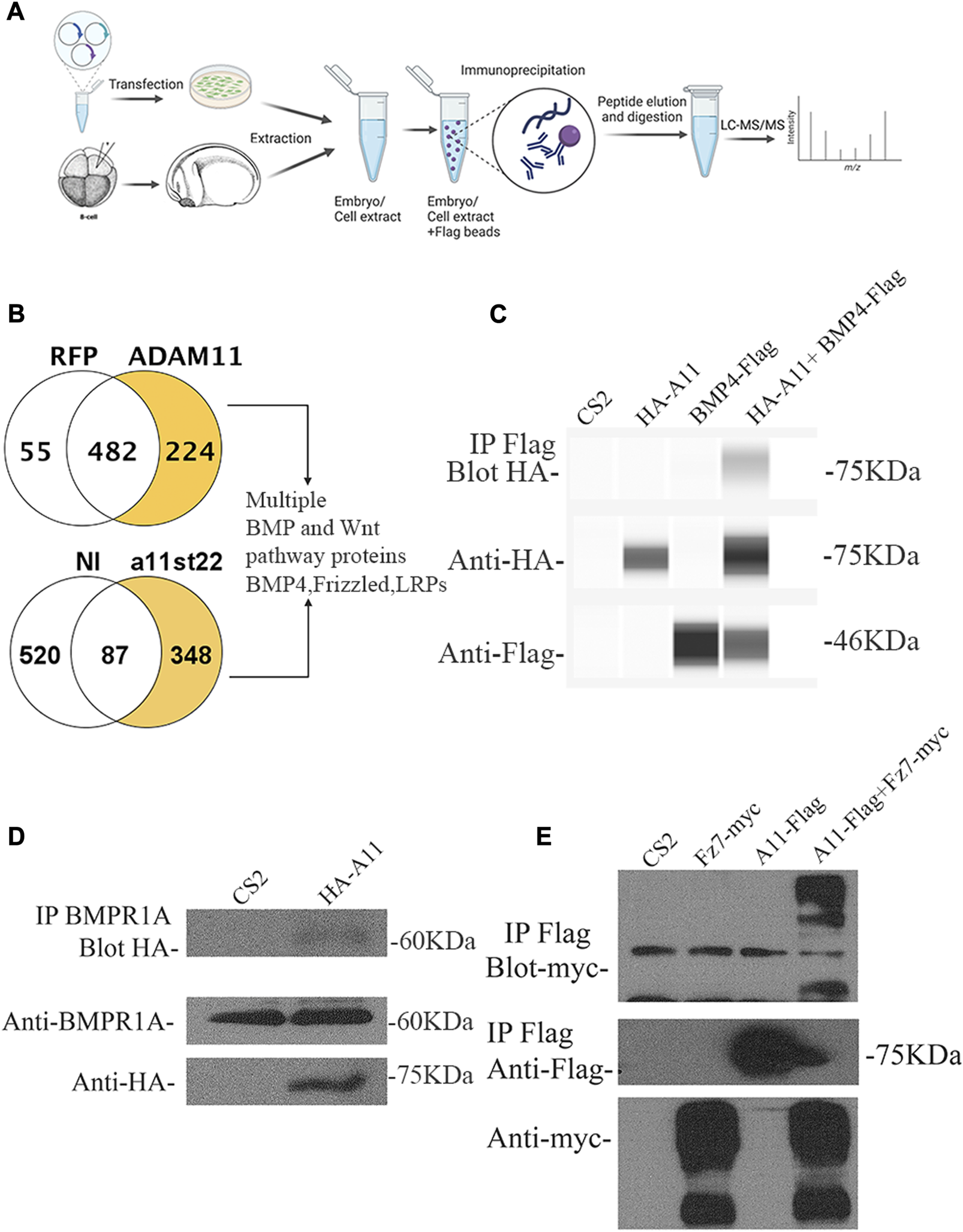 Adam11 binds to proteins of the BMP4 and Wnt signaling pathways. (A) Schematic representation of the Lc/Ms/Ms experiment. Both human Hek293T cells and embryos were used to produce Adam11.L-Flag. Hek293T cells were transfected while embryos were injected at the 8-cell stage in a dorsal animal blastomere to target CNC with Adam11.L-flag mRNA or an irrelevant flag-tagged protein (RFP-Flag). The embryos were grown until stage 22 sorted and extracted. The Flag-tagged proteins were immunoprecipitated and subjected to protein digestion and LC/MS/MS. (B) Proteins identified in either Xenopus embryos (348) or Hek293T cells (224) with at least two unique peptides that were absent in the negative controls were compared. (C) BMP4 binding to Adam11.L (HA-A11) was confirmed by co-immunoprecipitation in Hek293T cells. HA-Adam11.L was co-transfected with BMP4-Flag. Immunoprecipitation (IP first line) was performed using an anti-Flag antibody, and Western blot (Blot) was performed with anti-HA antibody. Total extracts blotted with HA (line 2) and with Flag (Line 3) are provided. (D) Endogenous human BMPR1A binding to Xenopus Adam11.L was confirmed by co-IP in Hek293T cells. HA-Adam11 (HA-A11) or empty CS2 vector were transfected. Immunoprecipitation (IP line 1) was performed using an anti-BMPR1A antibody, and Western blot (Blot) was performed with anti-HA. Total extracts were blotted with anti-BMPR1A (Line 2) and anti-HA (Line 3) antibodies. (E) Frizzled7 (Fz7) binding to Adam11 was confirmed by co-IP in Hek293T cells. Adam11-Flag (A11-Flag) was co-transfected with Frizzled7-myc (Fz7-myc). Immunoprecipitation was performed using an anti-Flag antibody (line 1 and 2), and Western blot was performed with anti-myc (Line 1) and anti-Flag (Line 2). Total extracts were blotted with the anti-myc (line 3) antibody.