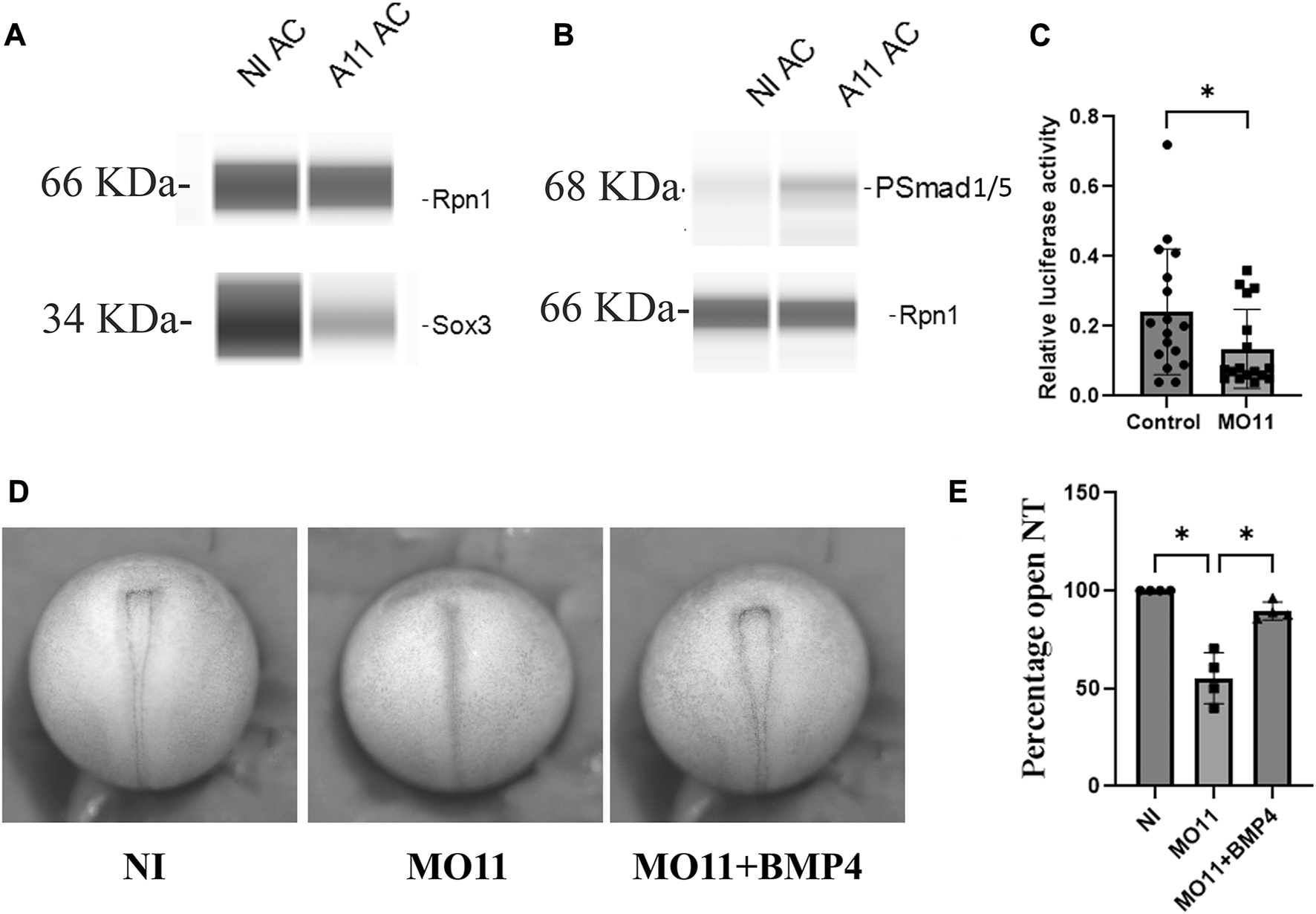 The following antibodies were used in this study: monoclonal antibody to Ribophorin-1 (Rpn1) was used as loading control, RRID:AB_2687673 (Khedgikar et al., 2017). The rat monoclonal to flag tag (Agilent Cat# 200474, RRID:AB_10597743). The monoclonal to X. laevis Sox3 (DSHB Cat# DA5H6, RRID:AB_2876376) was developed in the laboratory (Horr et al., 2023) against the full length X. laevis protein produced in Hek293T cells. It has been characterized by Western blot and immunofluorescence (R24OD21485). The rabbit polyclonal to HA tag (Applied Biological Materials Cat# G166, RRID:AB_2813867). The Rabbit monoclonal to phospho-Smad 1/5 (Cell Signaling Technology Cat# 9516, RRID:AB_491015). Mouse monoclonal to BMPR1A (Thermo Fisher Scientific Cat# MA5-17036, RRID:AB_2538508). Rabbit polyclonal to β-catenin (Abcam Cat# ab16051, RRID:AB_443301). Rabbit polyclonal to Cyclin-D1 (Bioss Cat# bs-0623R, RRID:AB_10856925). Mouse monoclonal to Hsp90ab1 (Thermo Fisher Scientific Cat# 37-9400, RRID:AB_2533349). The anti-myc antibody 9E10 (DSHB Cat# 9E 10, RRID:AB_2266850). Rat monoclonal against N-cadherin (DSHB Cat# MNCD2, RRID:AB_528119). Mouse monoclonal to X. laevis Adam11.L (3C5) was developed in the lab by injecting a bacterial fusion protein containing the DC (disintegrin and cystein rich) domain and isolating the clone by the methods described in (Horr et al., 2023).