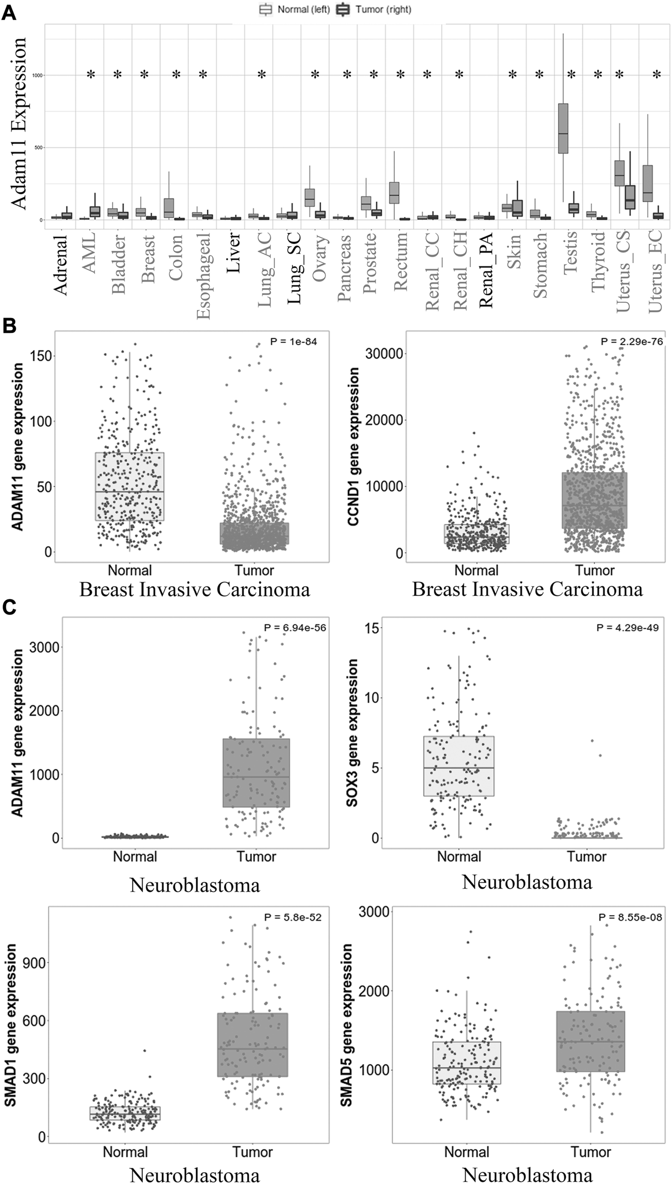 ADAM11 expression in cancer and cancer metastasis. (A) Tnm plot analysis of ADAM11 expression levels between normal tissue samples and tumors pan-cancer from human patients. Tumor types with significant changes in ADAM11 expression are indicated with an asterisk. (B) Tnm plot analysis of ADAM11 and CYCLIND1 expression between multiple normal (403) and tumor (1,097) breast invasive carcinoma patient samples. (p = 10−54 and p = 2.29 10−76 respectively). (C) Tnm plot analysis of ADAM11 (p = 5.94 10−56), SOX3 (p = 4.29 10−49), SMAD1 (p = 5.8 10−52), and SMAD5 (p = 8.55 10−5) expression between Neuroblastoma (149) and normal (190) patient samples. Mann-Whitney test was performed for the p-values indicated in the legend. The Y-axis for figure (B), (C) represents normalized counts for the gene mentioned.