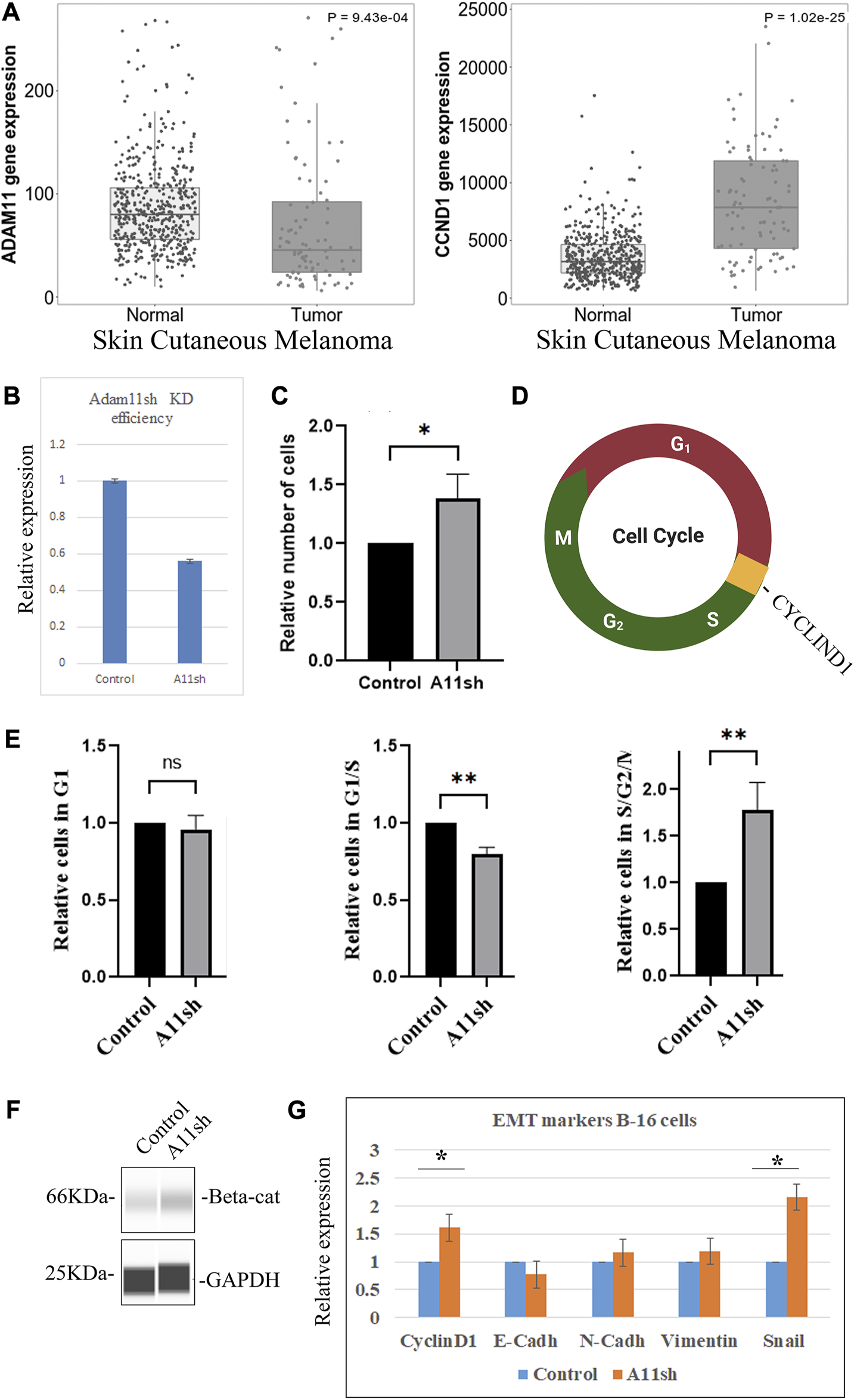 ADAM11 expression in Melanoma. (A) Tnm plot analysis of ADAM11 (p = 9.43 10−4) and CYCLIND1 (p = 51.02 10−25), expression between multiple normal (474) and (103) skin cutaneous melanoma tumor patient samples (Y-axis represents normalized counts for the gene mentioned). (B) RT-qPCR analysis of mouse B-16 melanoma cells transfected with either empty plasmid control or shRNA to mouse Adam11 (A11sh). Cells were harvested for mRNA and processed for RT-qPCR. Adam11 levels between the samples was normalized to Beta-actin.(C) Histogram showing the relative number of cells present 48 h post-transfection in control and shA11 wells. (D) FUCCI cell cycle reporter. Cells transfected with the FUCCI reporter fluoresce in Green during the S, G2, and M phase, in Red during G1 and Yellow (both red and green) during the G1/S transition. (E) Histogram depicting the relative number of cells in each phase of the cell cycle following silencing of mouse Adam11 (A11sh). The relative number of cells in each phase was set to one for the control. Cell numbers were obtained by FACS analysis (50,000 cells counted per experiment, three independent experiments, **=p < 0.01). As expected, given the regulation of CyclinD1, significantly fewer cells were found in the G1 to S transition and more cells in S, G2, and M. (F) Capillary Western blot of B-16 melanoma cells transfected with either empty plasmid control or Adam11sh (A11sh) plasmid, probed with β-catenin and Gapdh antibodies. (G) RT-qPCR analysis of B-16 melanoma cells transfected with either empty plasmid control or A11sh plasmid. Cyclind1, E-cadherin, N-cadherin, Vimentin, and Snail levels between the samples was normalized to Beta-Actin. The fold change calculated using the ΔΔCT is indicated. Error bars represent the standard deviation (* means p < 0.05).
